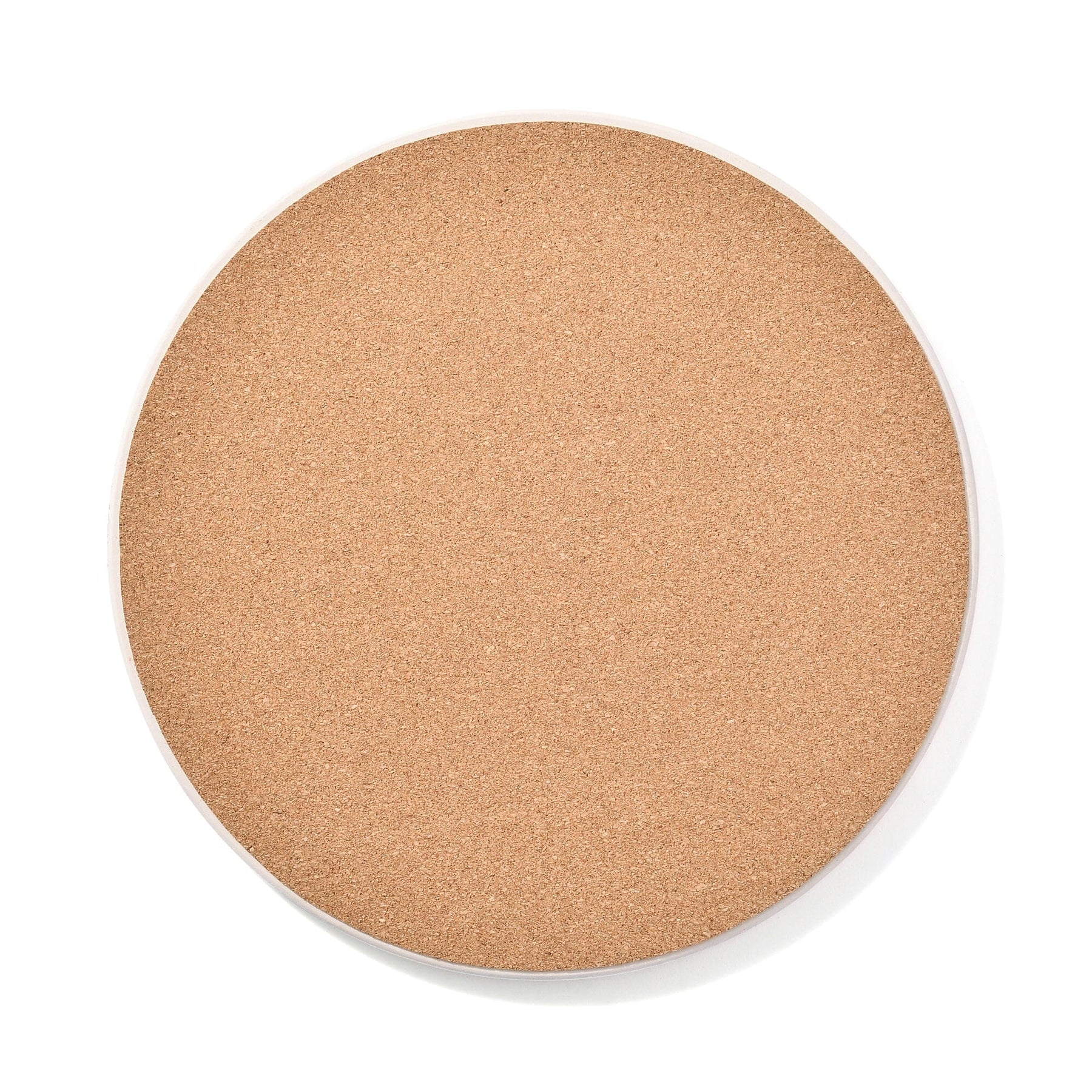 The back is finished with cork to prevent scratches on tables and other surfaces.