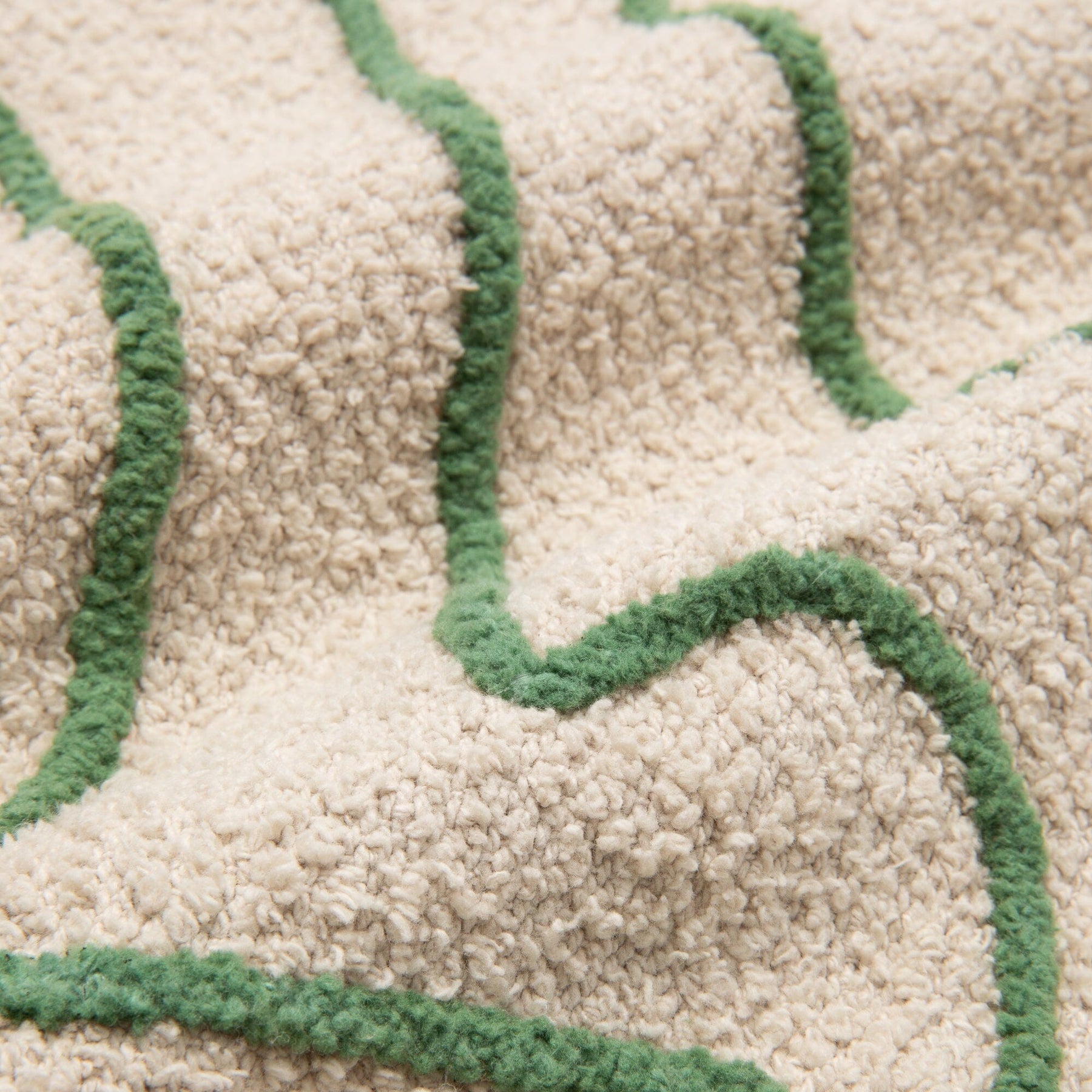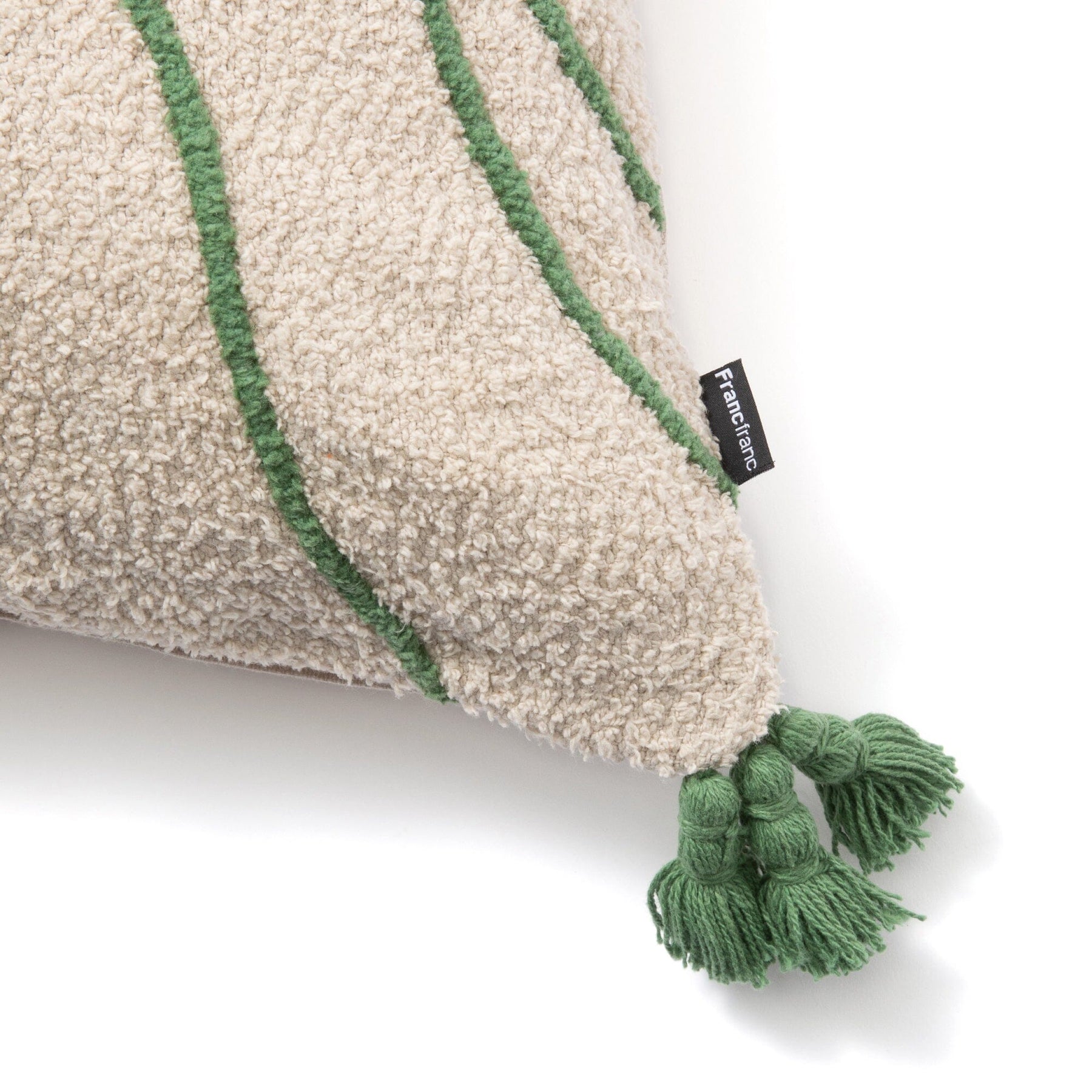 This cushion cover features textured fabric and three-dimensional embroidery with organic lines.
