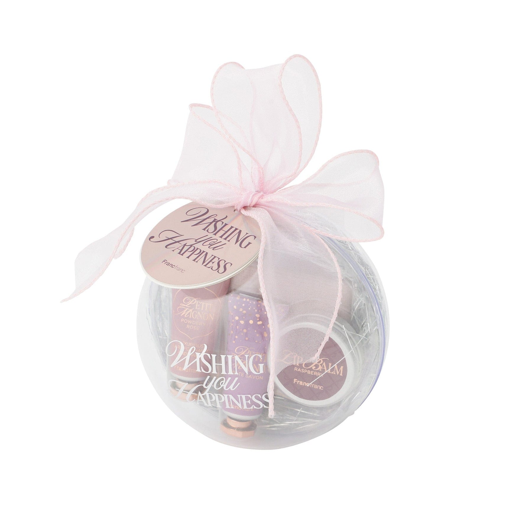 This gift set comes in cute ornament-like packaging and includes a half handkerchief, lip balm, and two bottles of hand cream.Its small size makes it easy to carry around in a mini bag.