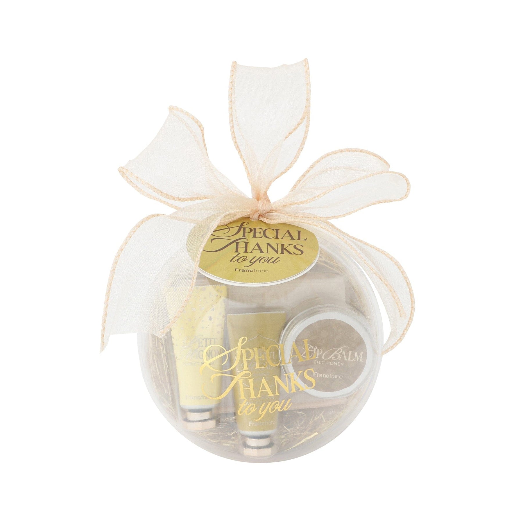 This gift set comes in cute ornament-like packaging and includes a half handkerchief, lip balm, and two bottles of hand cream.Its small size makes it easy to carry around in a mini bag.