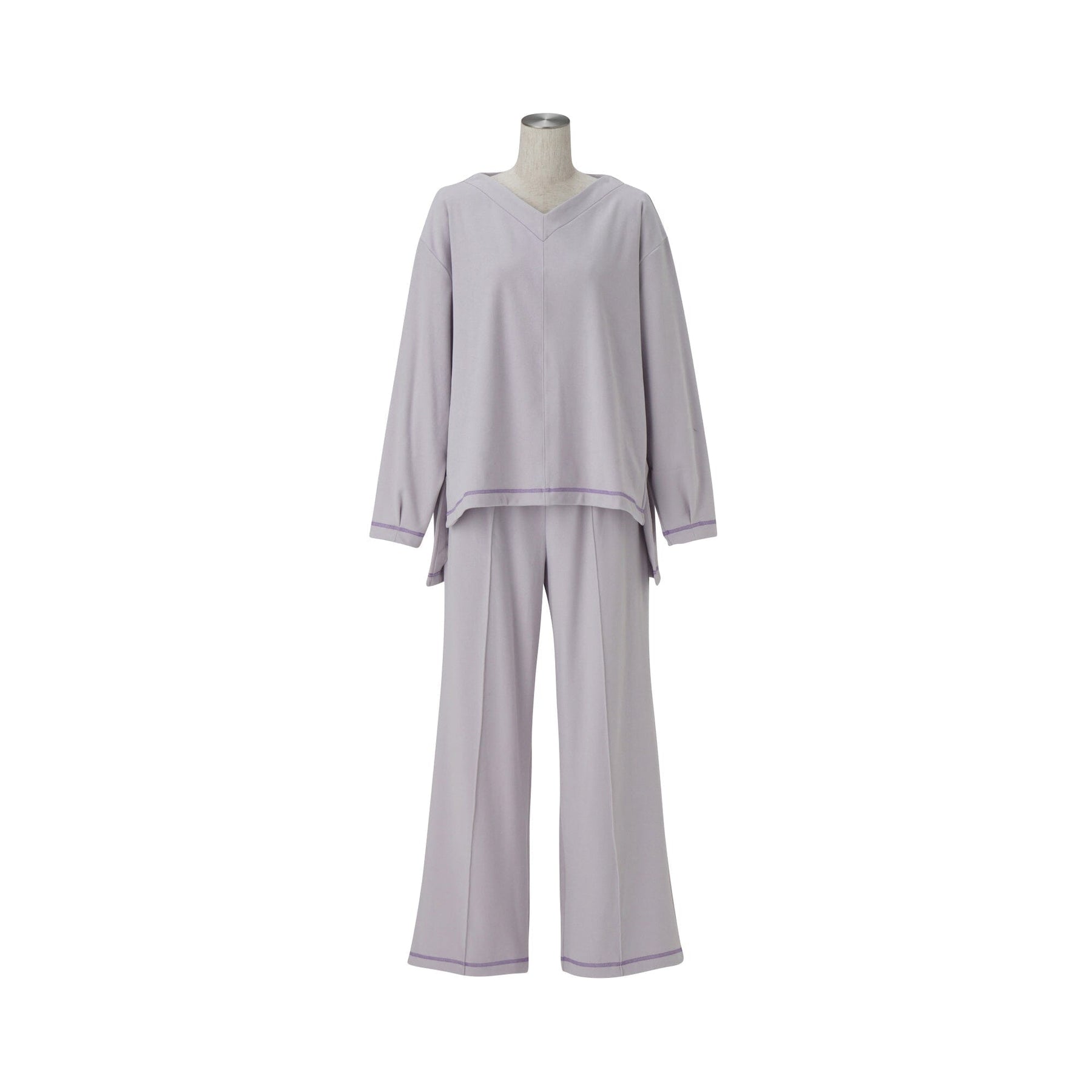 This sweatsuit loungewear features a highly stretchable fabric with moisture-wicking and release properties. "Moisture-wicking" processing absorbs moisture when humidity levels are high and releases it when temperatures are dry. You can expect a dry, comfortable fit at all times. The top and bottoms feature a flattering vertical line at the center. It creates a streamlined silhouette. Perfect for loungewear, or as relaxing wear for long trips by plane or car. The bottoms feature pockets. Made with moisture-wicking fabric. Experiences may vary depending on the environment and individual preferences. The effects of this processing are not permanent. The color of the model wearing the item may appear different depending on the shooting environment (location, lighting, etc.). Please refer to the individual image for color reference.Specifications