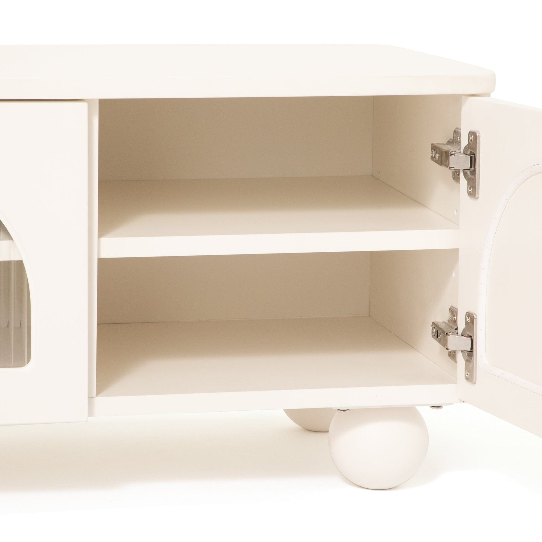 This TV stand features striking semicircular doors and rounded corners, creating a unique and trendy look.The two central doors are made of glass, allowing you to operate the remote control even when the doors are closed.