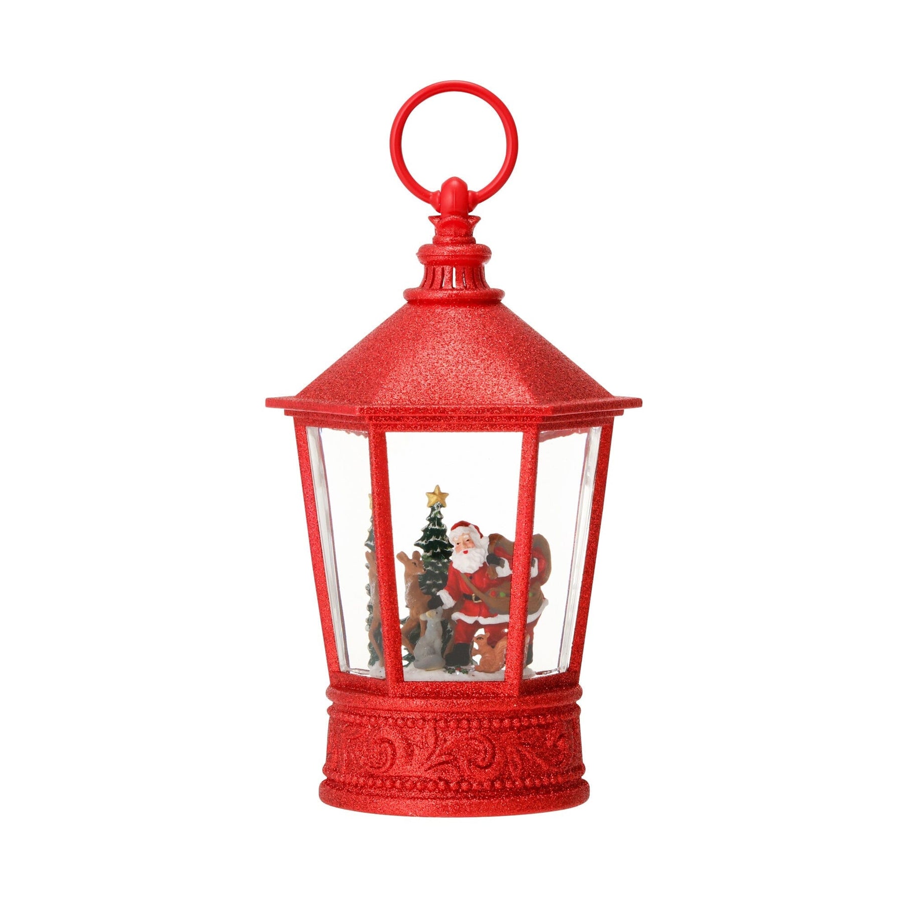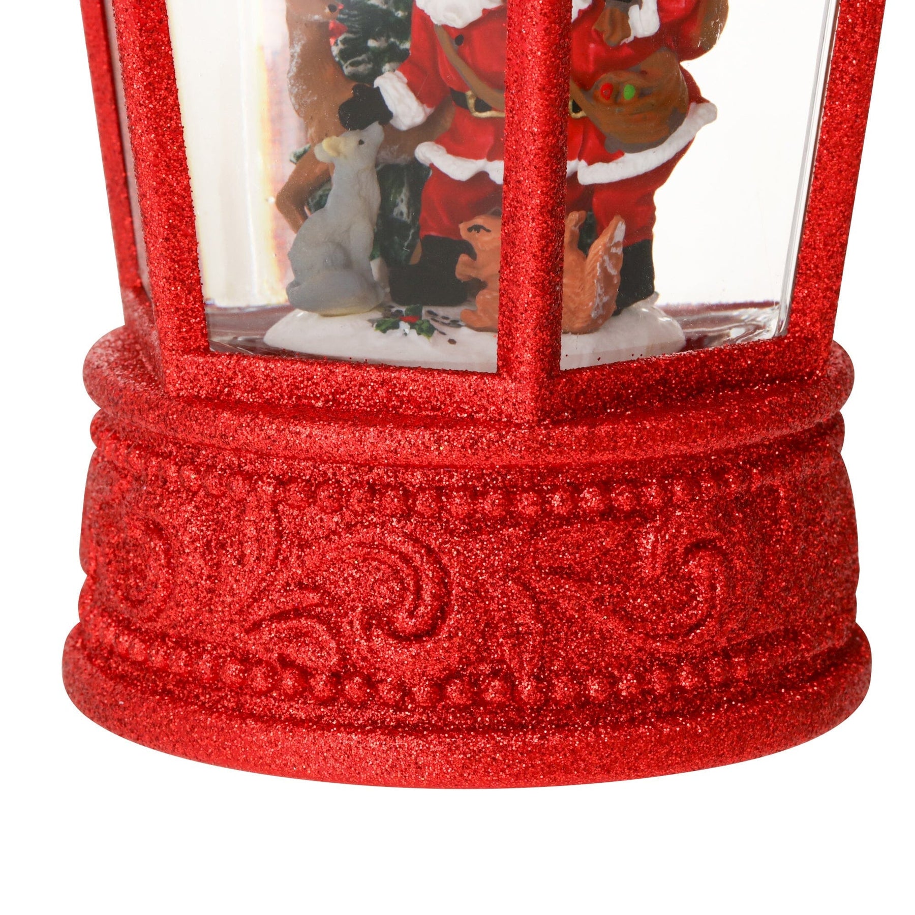 The design, featuring Santa Claus holding a gift bag inside the lantern and miniature animals, is reminiscent of a fairy tale illustration.