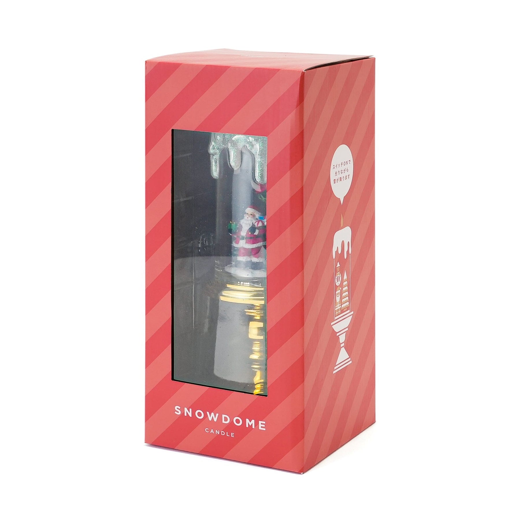 The candle contains a miniature Santa Claus holding a present, creating a warm, Christmas-like design.