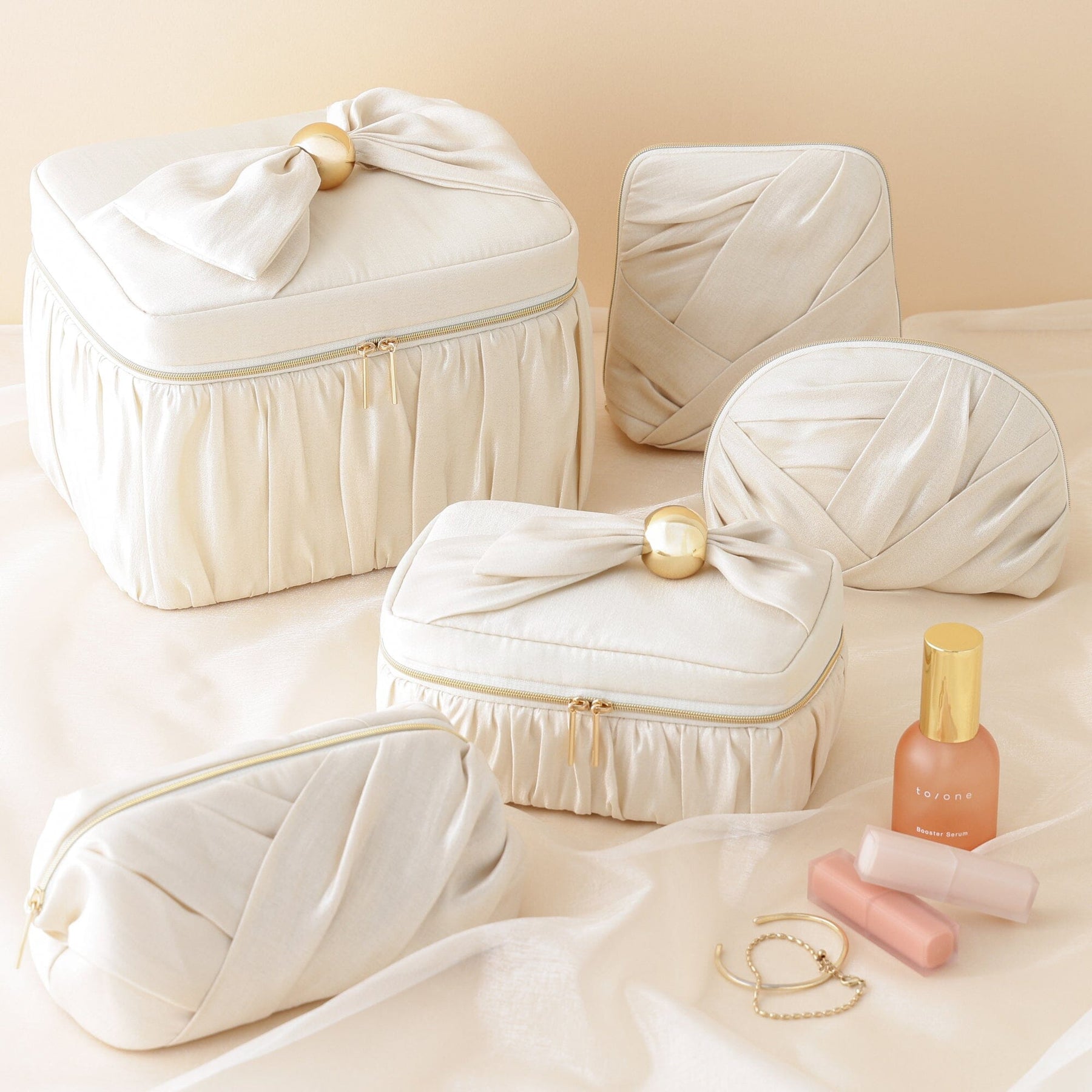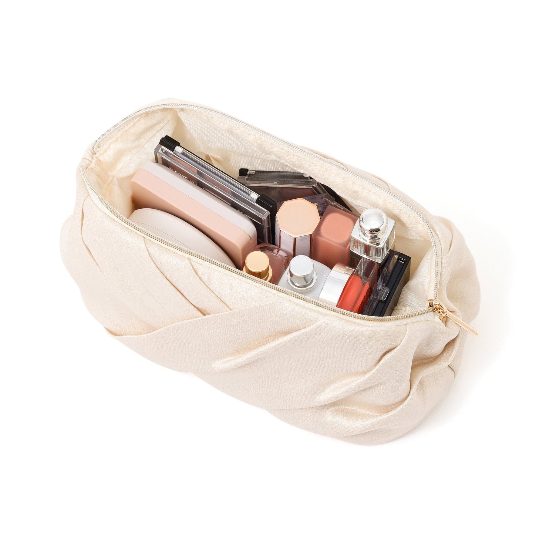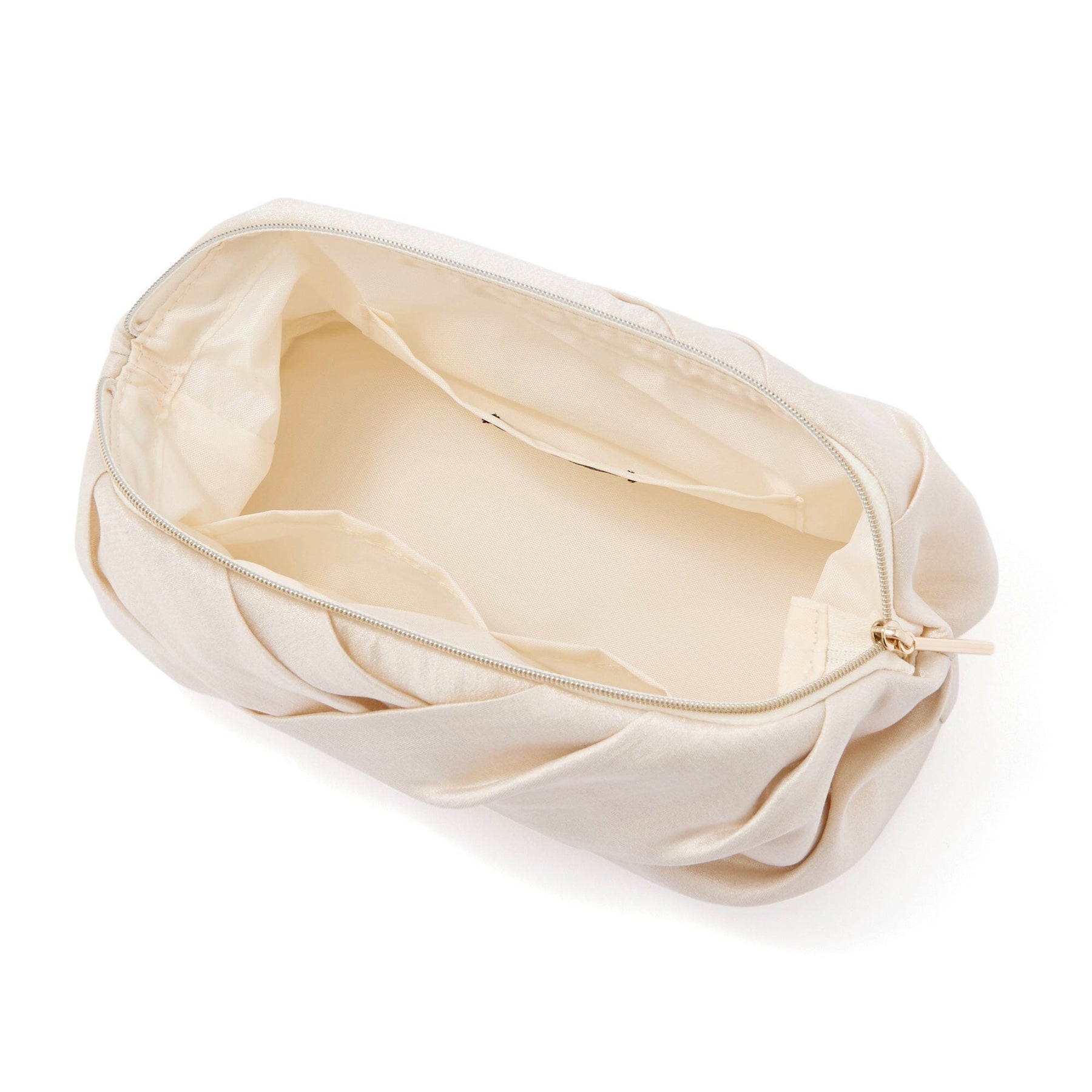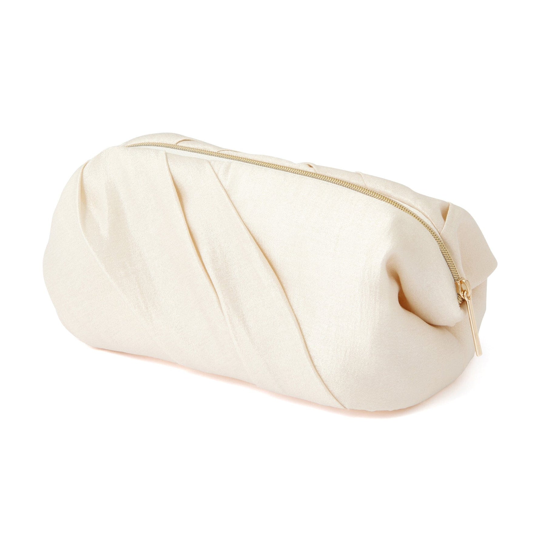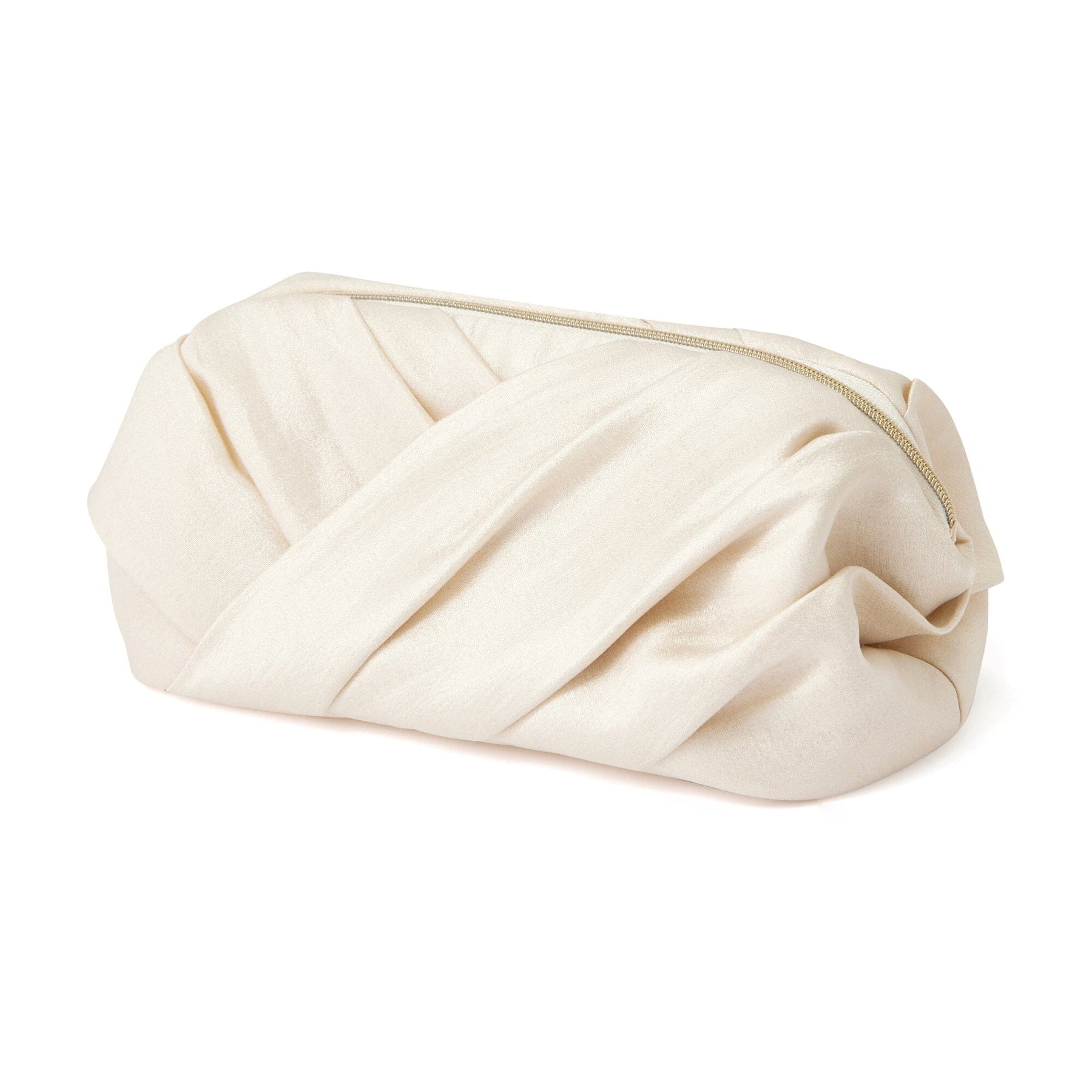 This pouch features a soft, pearlescent fabric with a gathered design reminiscent of a flower bud, creating a sophisticated look.
