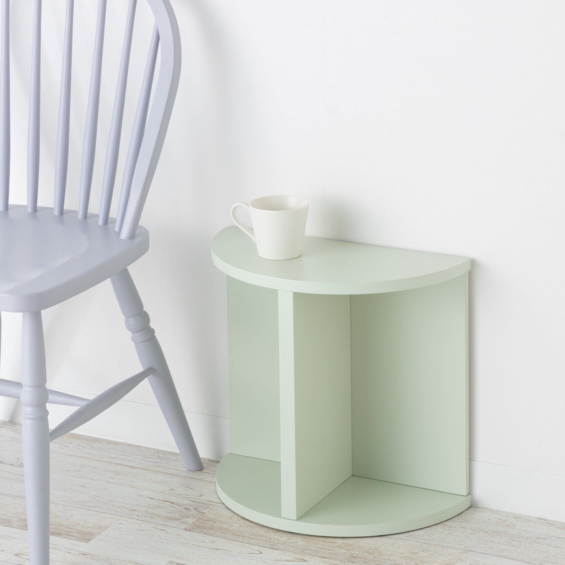 This semicircular side table can be freely arranged to suit any space. The soft pastel green brings a sense of freshness and tranquility to any space, adding a touch of comfort to any interior.