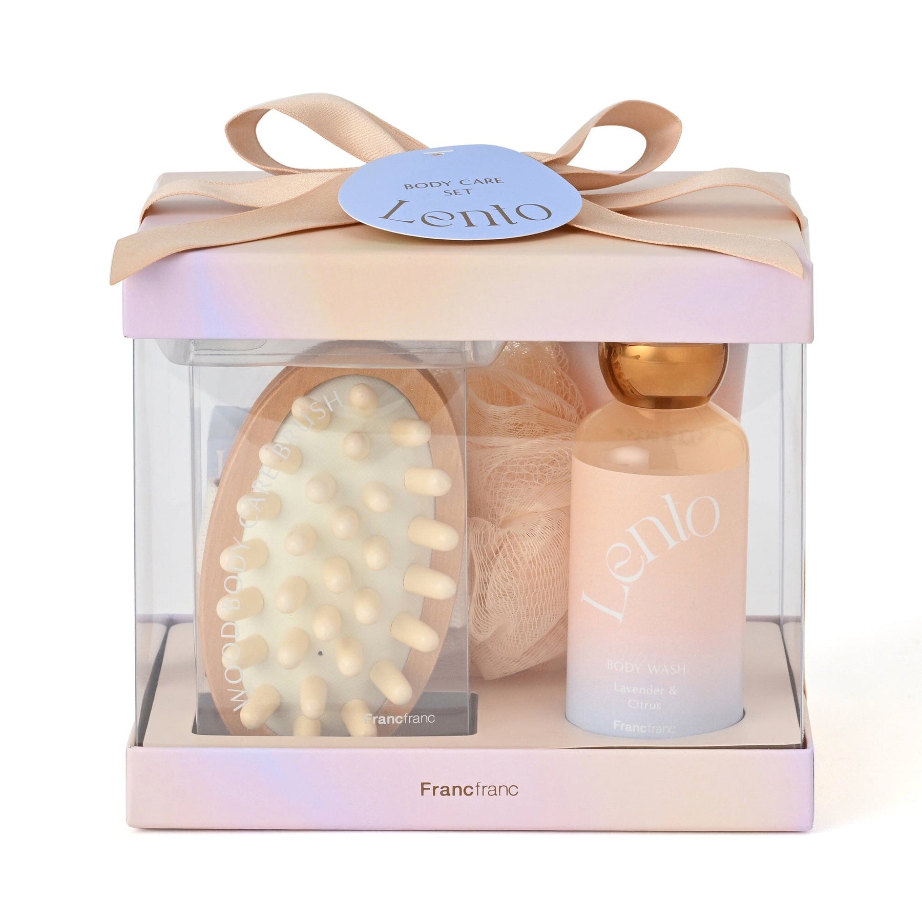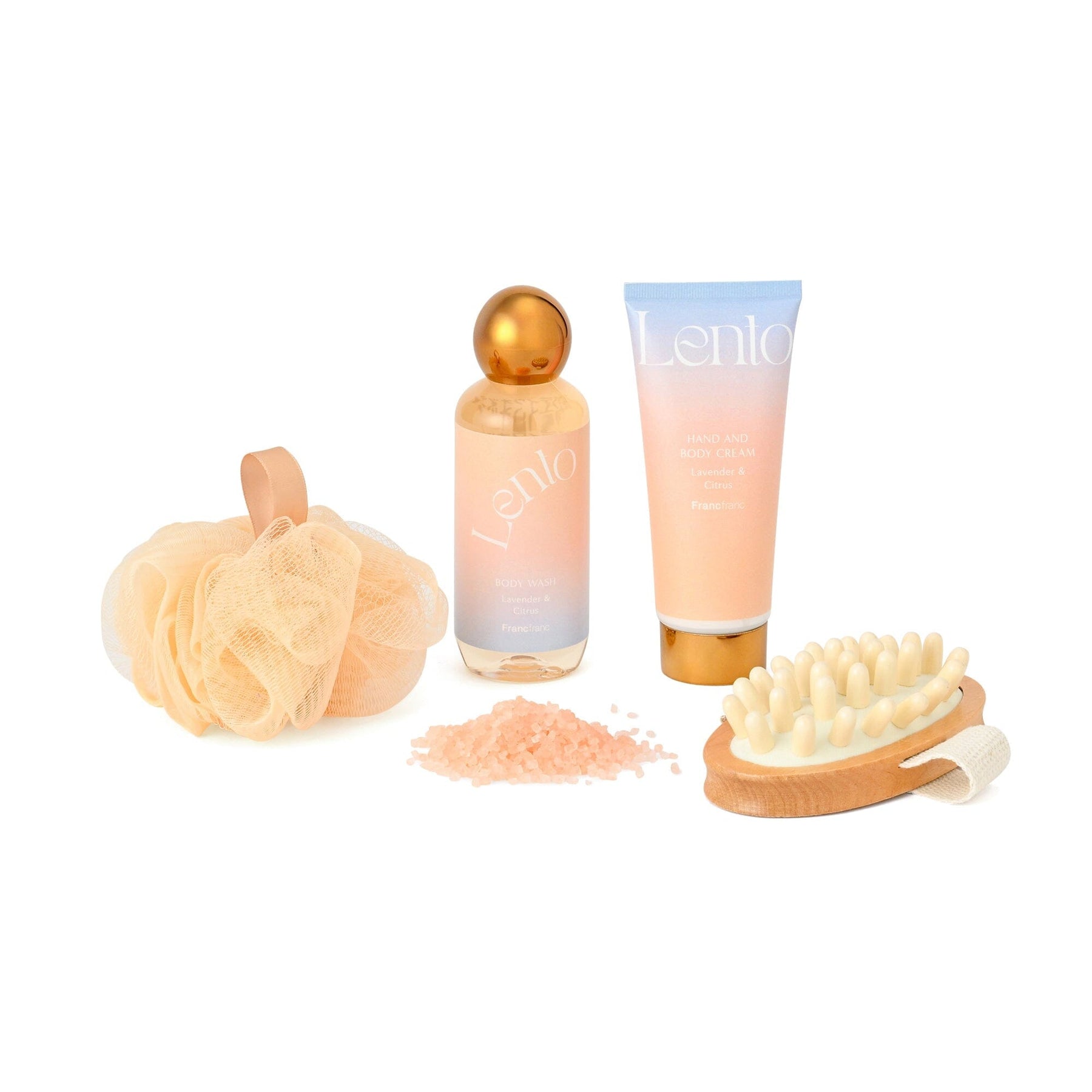 This luxurious 5-piece set includes a wooden body care brush, hand and body cream, body wash, bath salts, and a bath sponge.