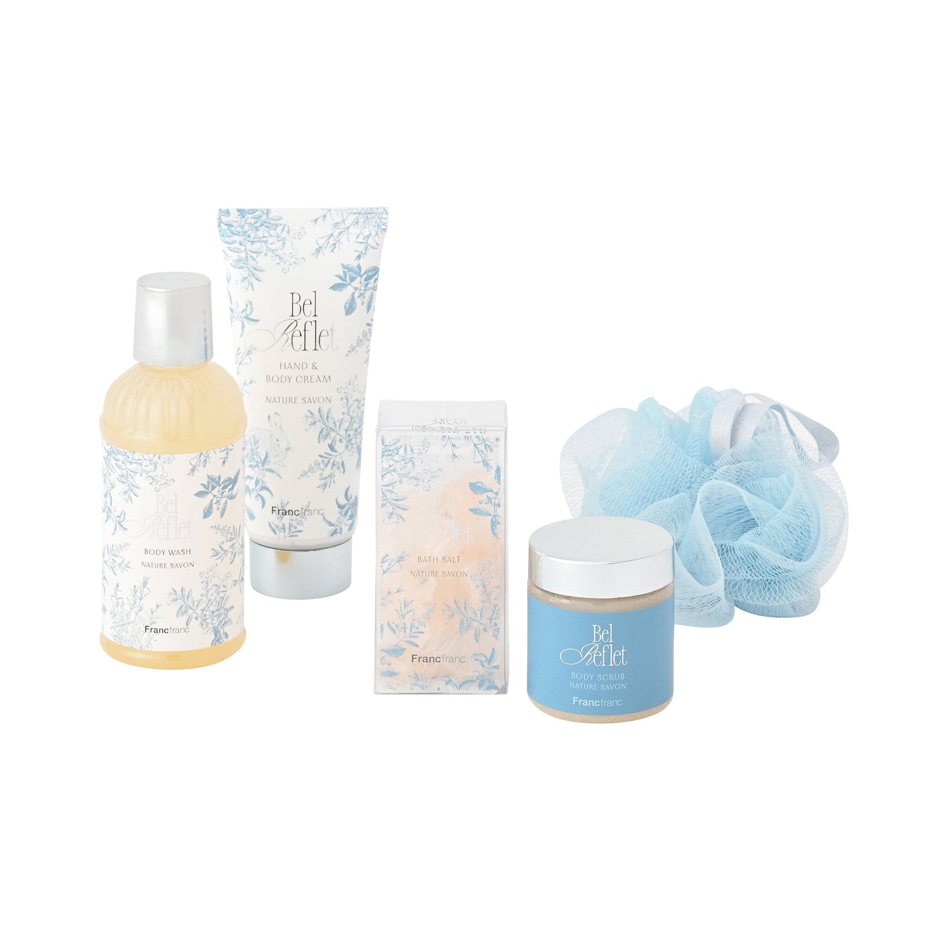 This luxurious 5-piece set includes hand and body cream, body wash, body scrub, bath salts, and a bath sponge.