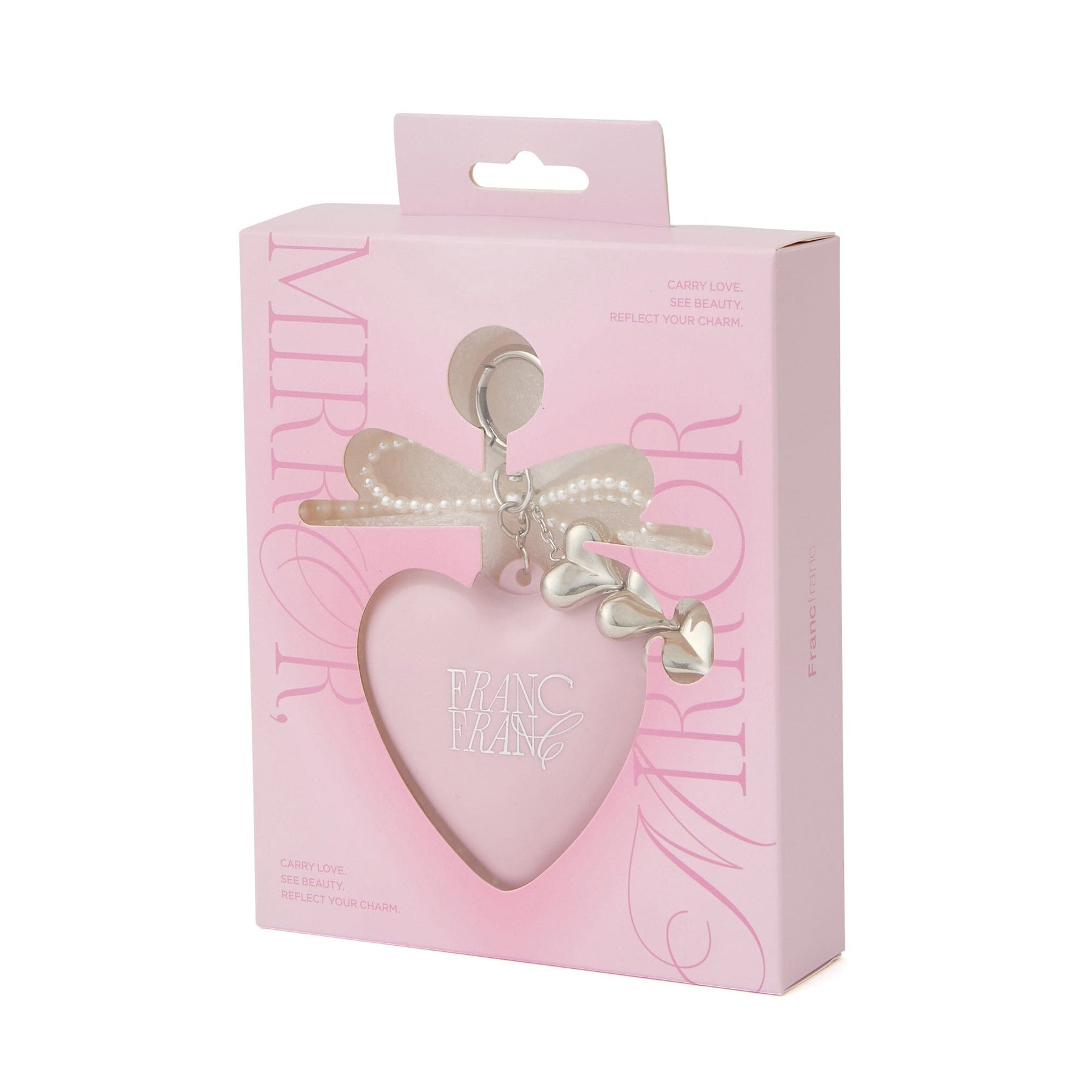 This is a mirror and brush set with a heart-shaped charm.It comes with a carabiner, so you can attach it to your bag as a large heart charm. When opened, it reveals a mirror and brush, perfect for quick lip or hair touch-ups on the go.
