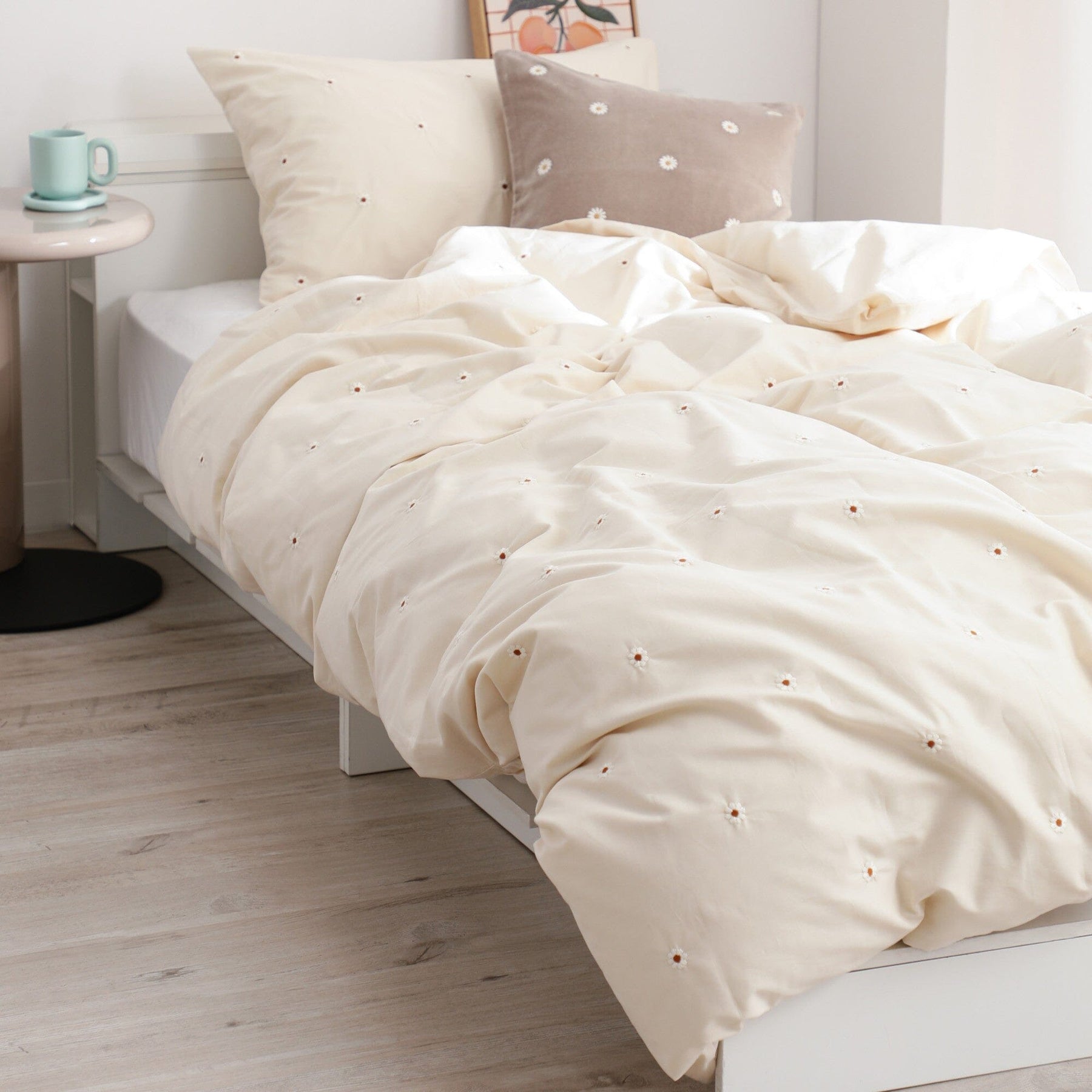 This duvet cover features a daisy motif embroidered on soft, 100% cotton fabric.