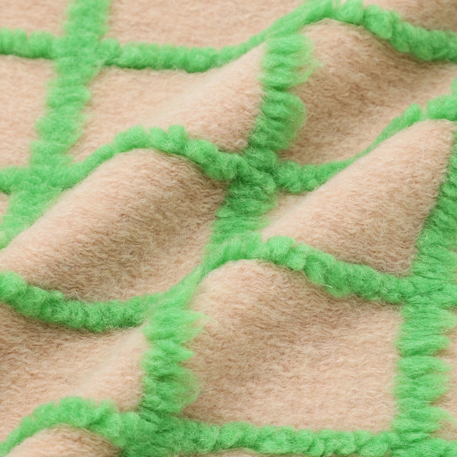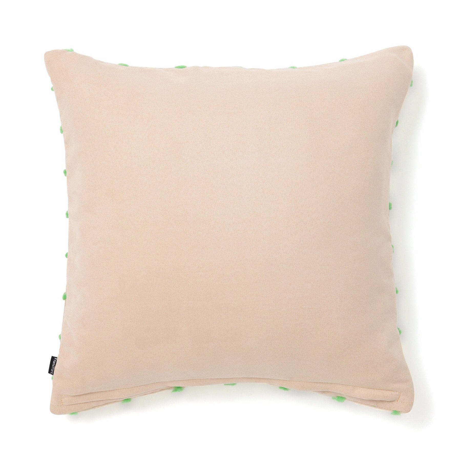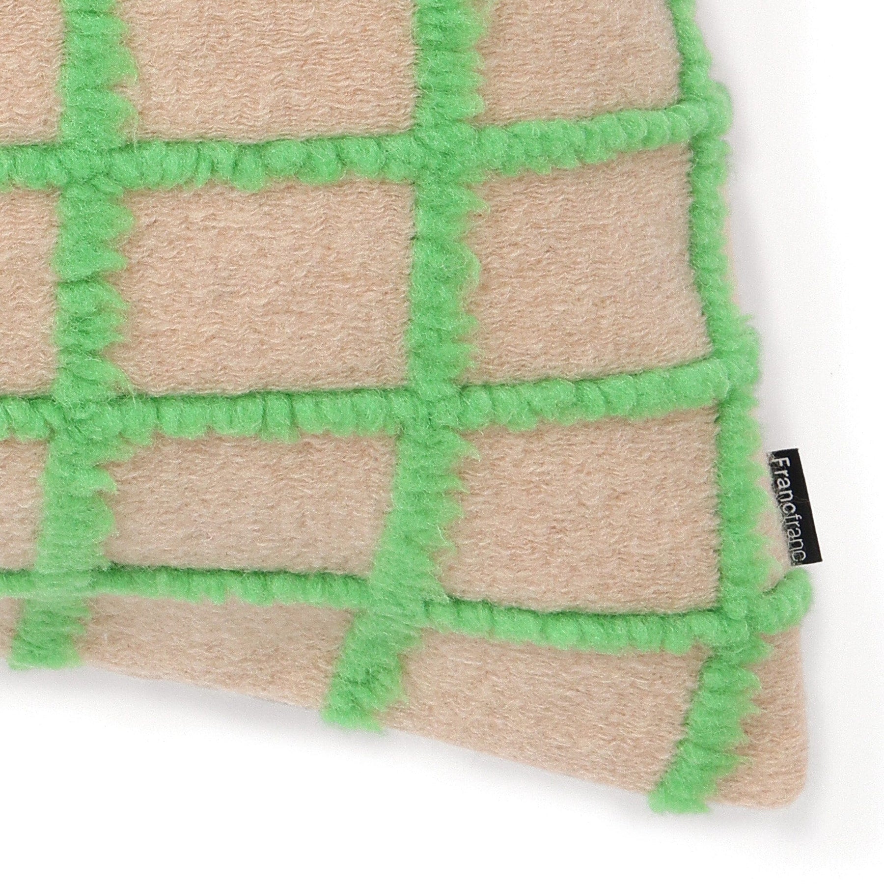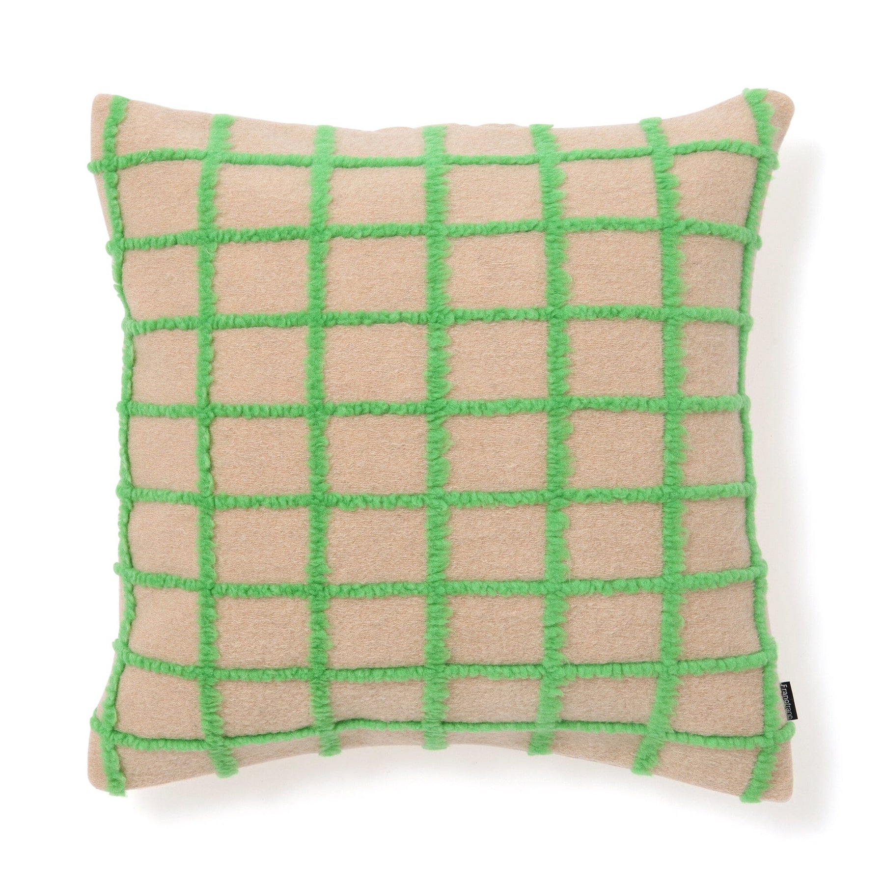 This cushion cover features a three-dimensional windowpane pattern made with soft, boa-like yarn.The beige base is accented with vibrant green lines, creating a design that adds just the right amount of individuality to a warm look.