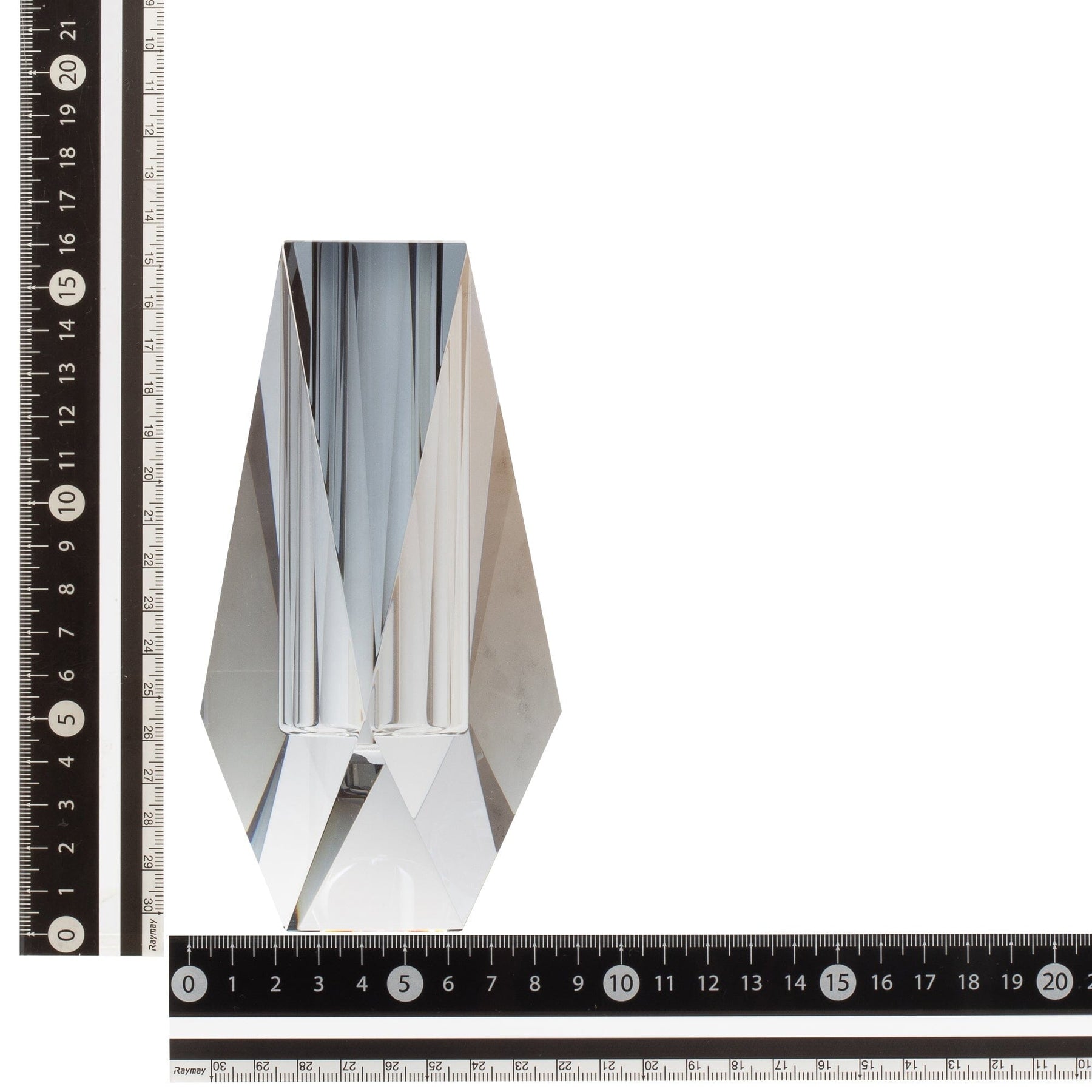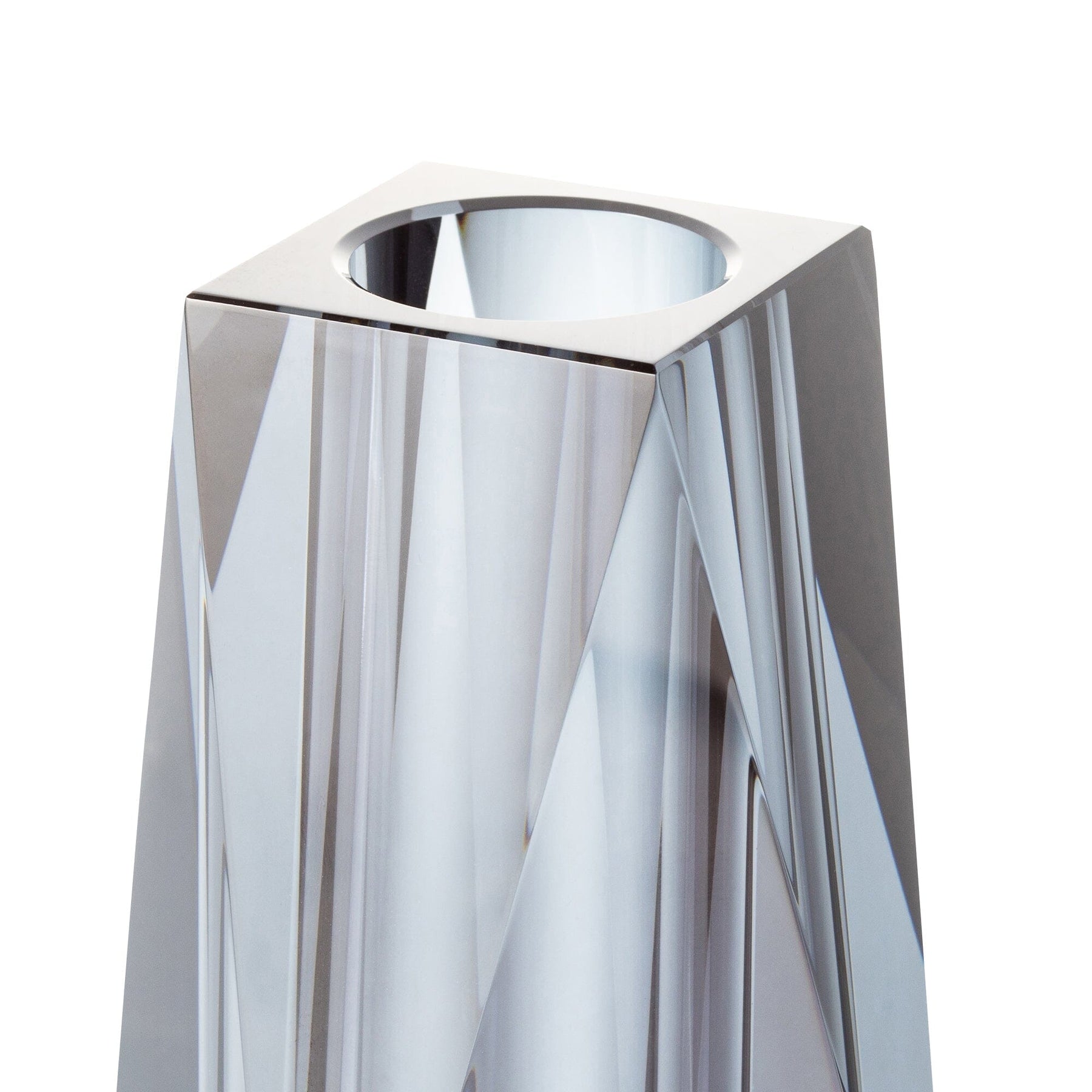 A glass flower vase with crystal cut details.Its sparkling appearance reflects light.