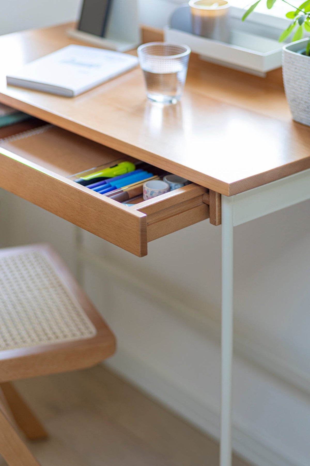 ■Natural design of beech wood and steel (white) ■Compact size of 800mm wide and 400mm deep ■Includes side hooks, a large-capacity drawer, a removable tray and stand ■Sufficient storage capacity allows for space-saving and efficient work