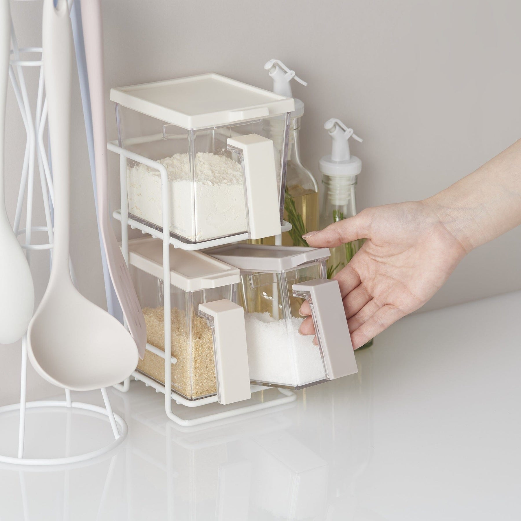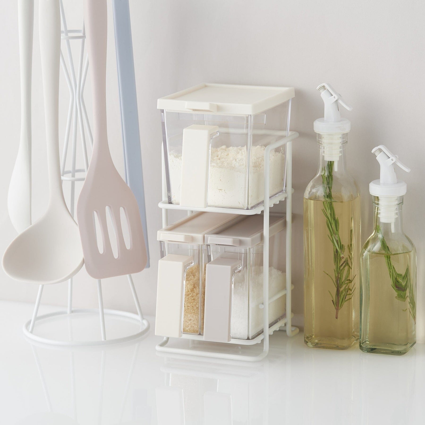 Material: Kitchen rack: Steel, Container body: AS, Lid: ABS, Spoon: PP, Gasket: Silicone rubber