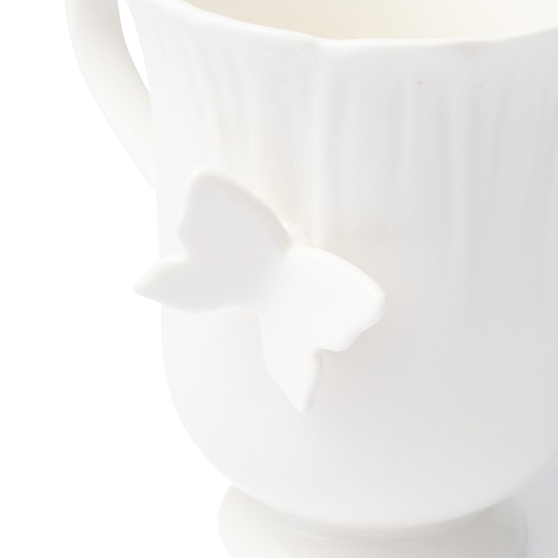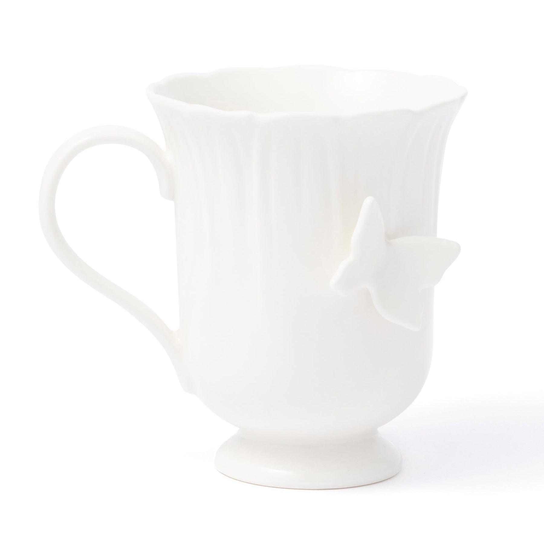 A lovely mug shaped like a flower.A butterfly is the focal point.