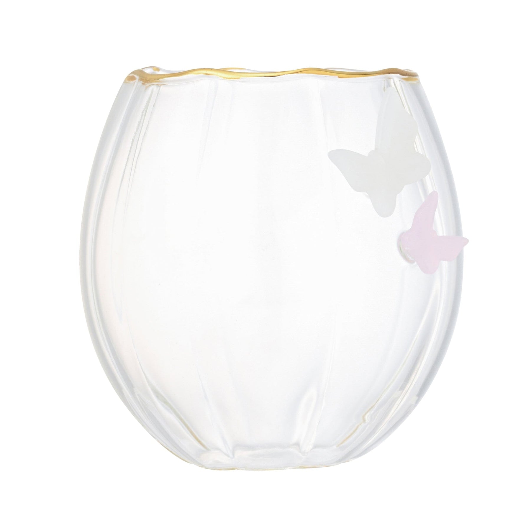 This tumbler is designed to resemble a butterfly perched on a flower-inspired glass.