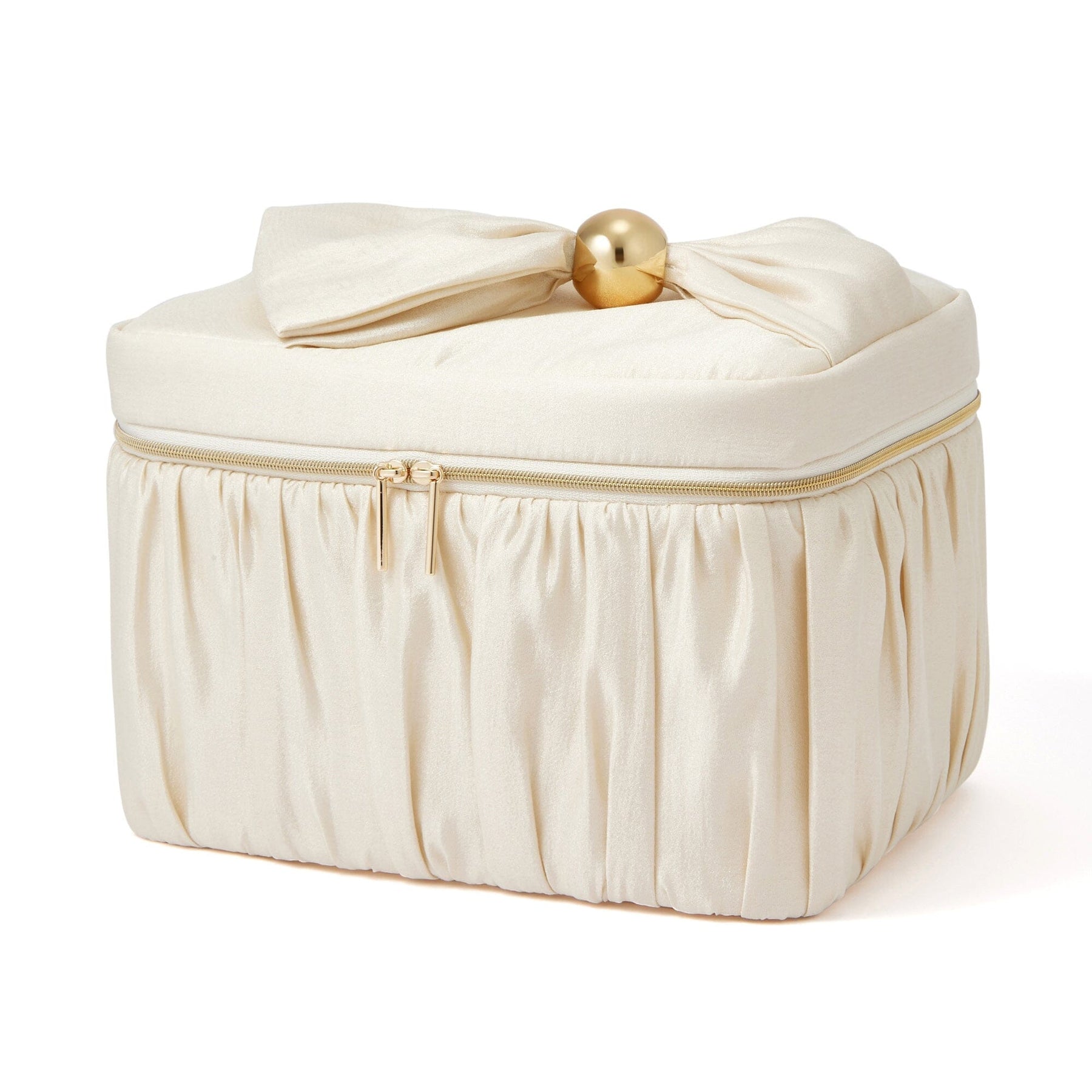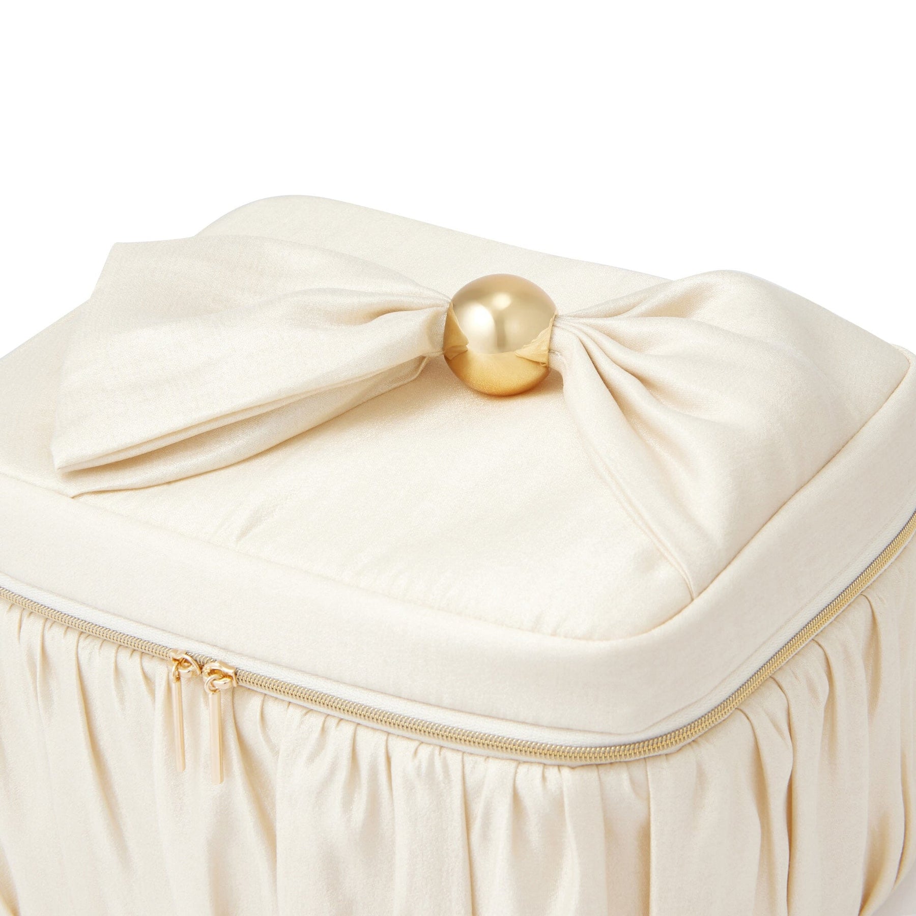 The vanity pouch features a large gold bead on the handle, adding a touch of individuality to its elegant design.