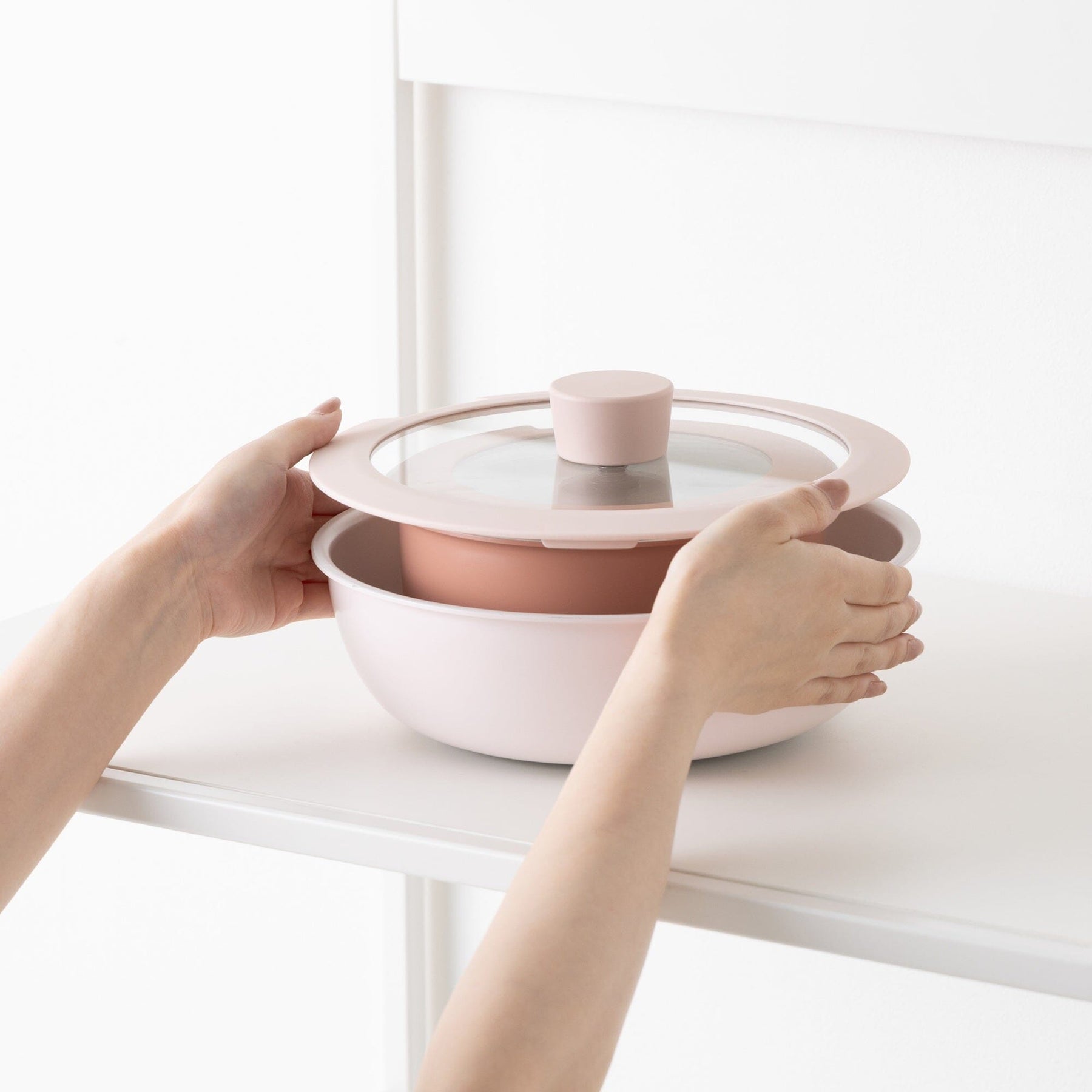 This handy 5-piece pot and pan set has detachable handles that allow them to be stacked for storage even in limited space.The cute pink gradation adds fun to your daily meal preparation.