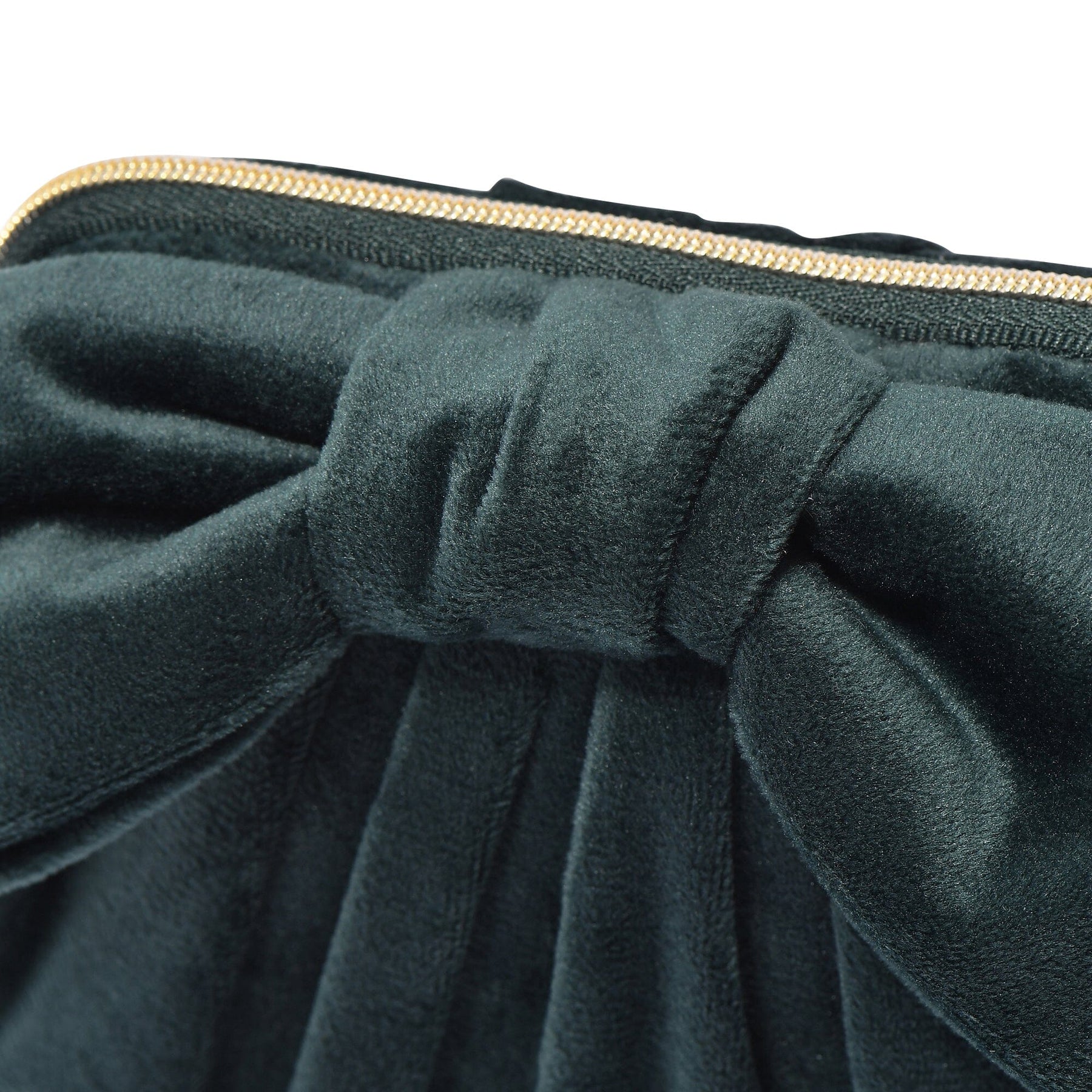 This pouch is made of shiny velour fabric and features a large ribbon.