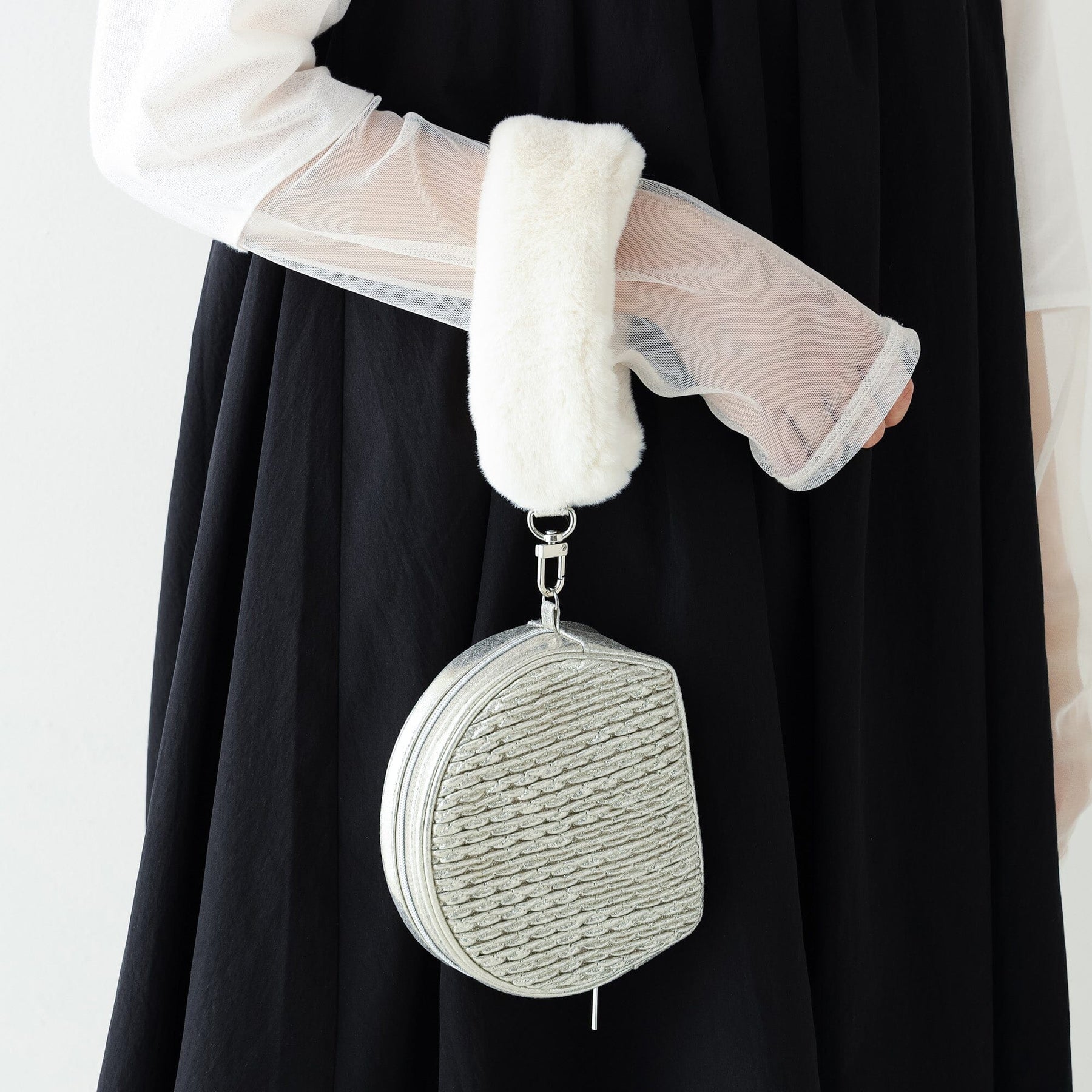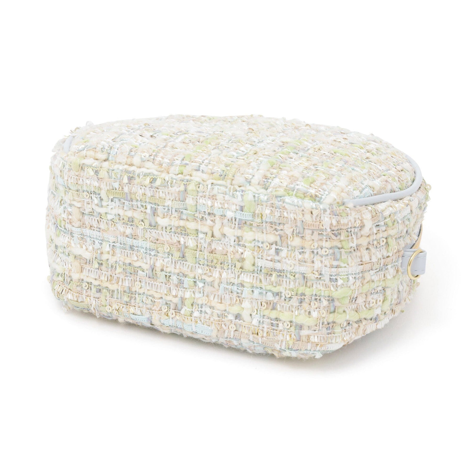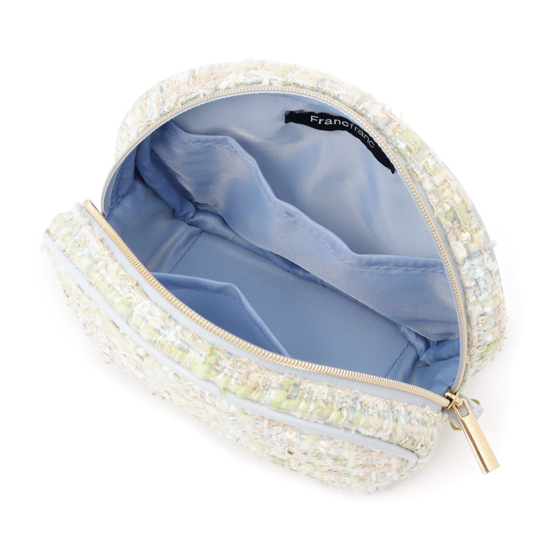 This pouch features a classic Francfranc design, combining pastel-colored tweed and fur.