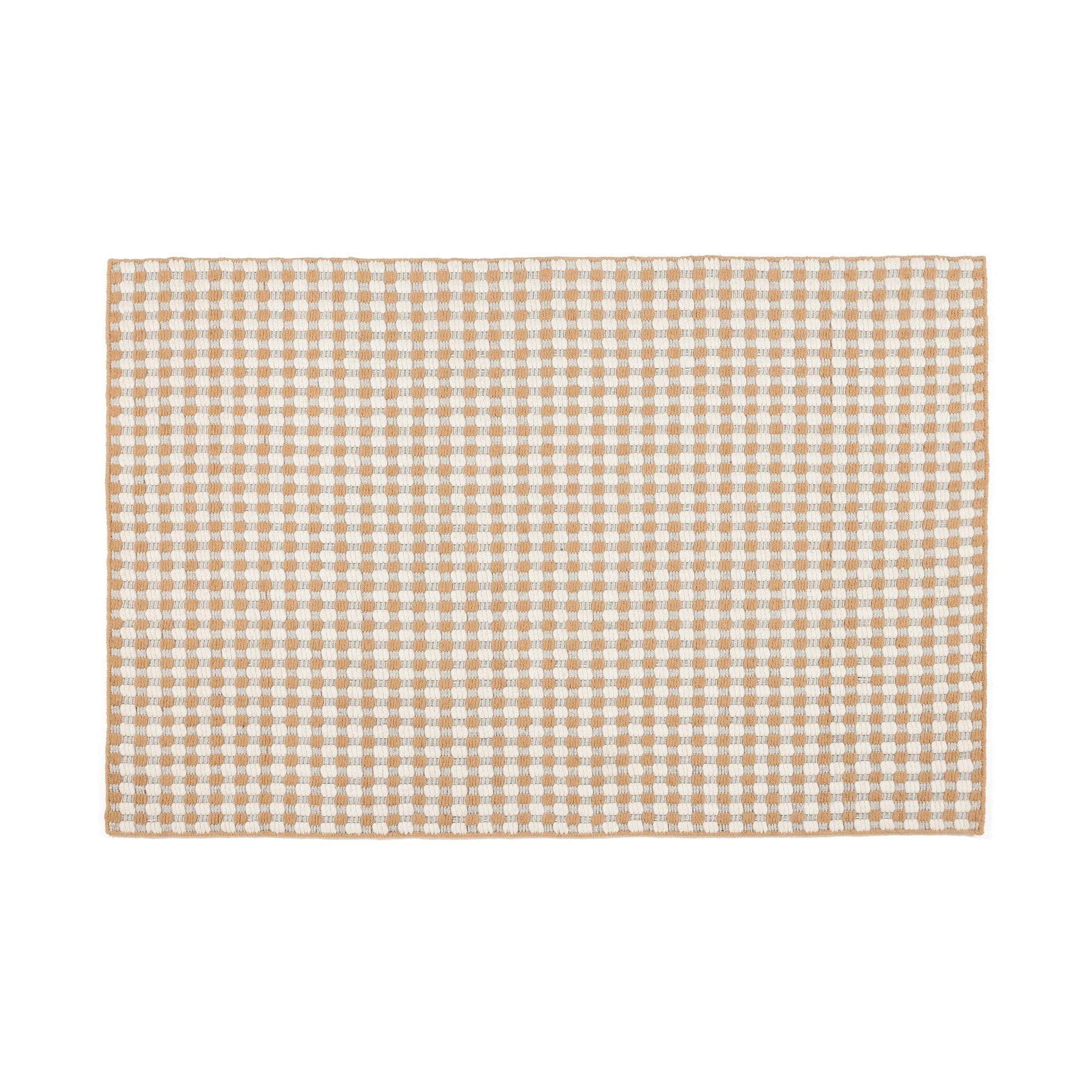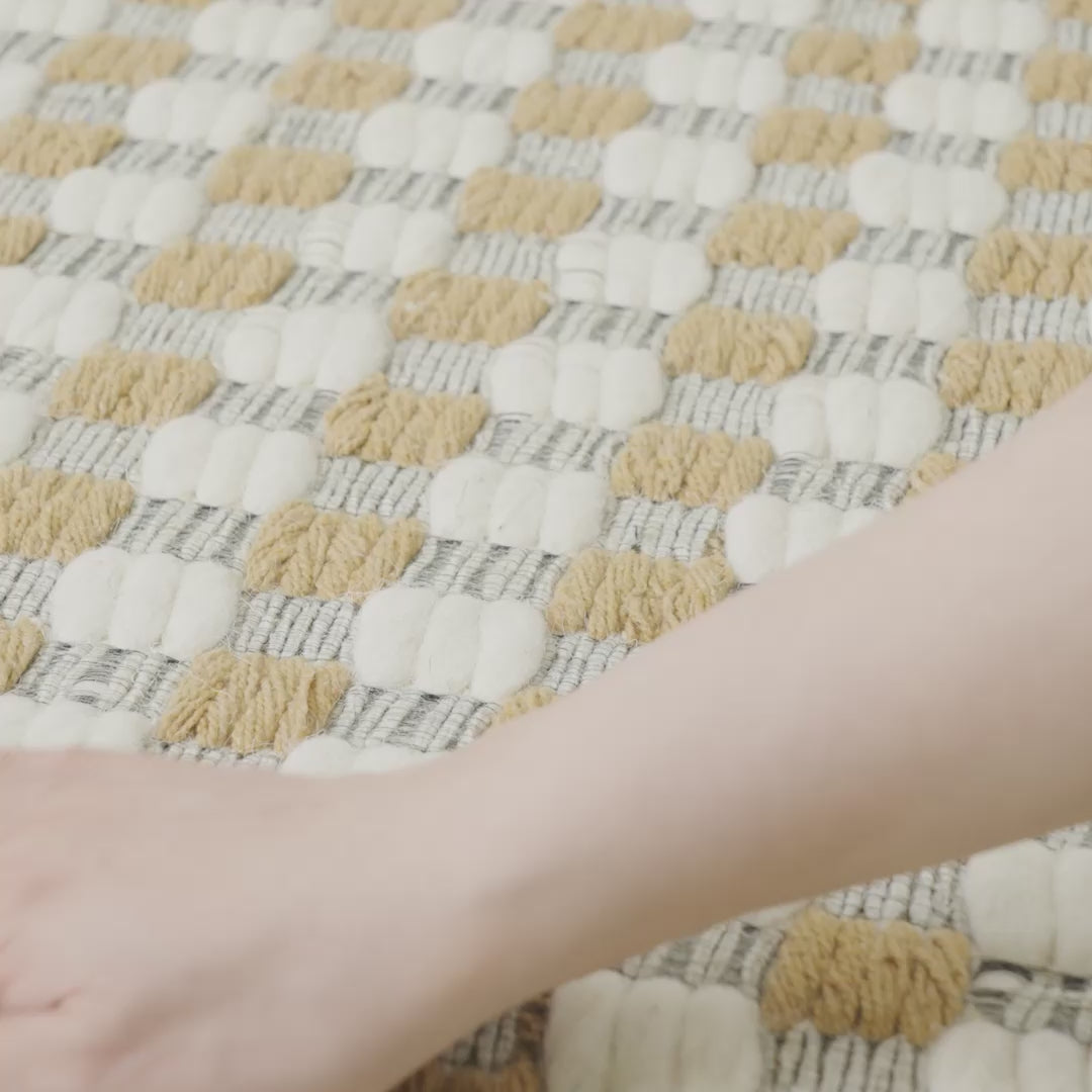 A beige checkered rug woven with wool material.