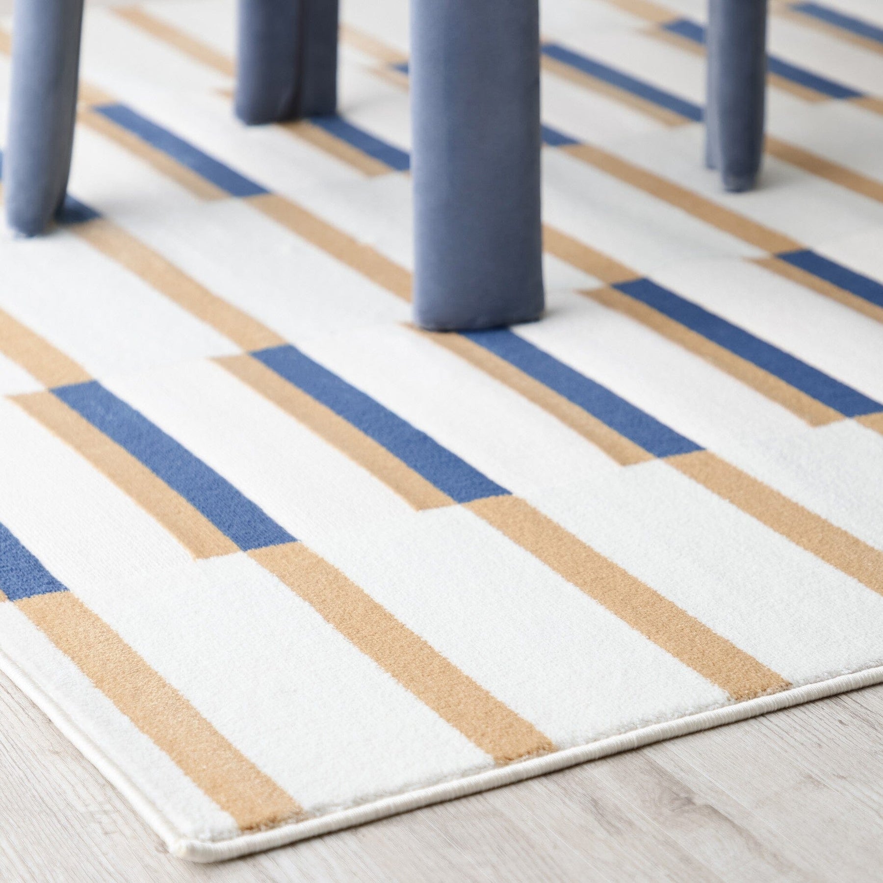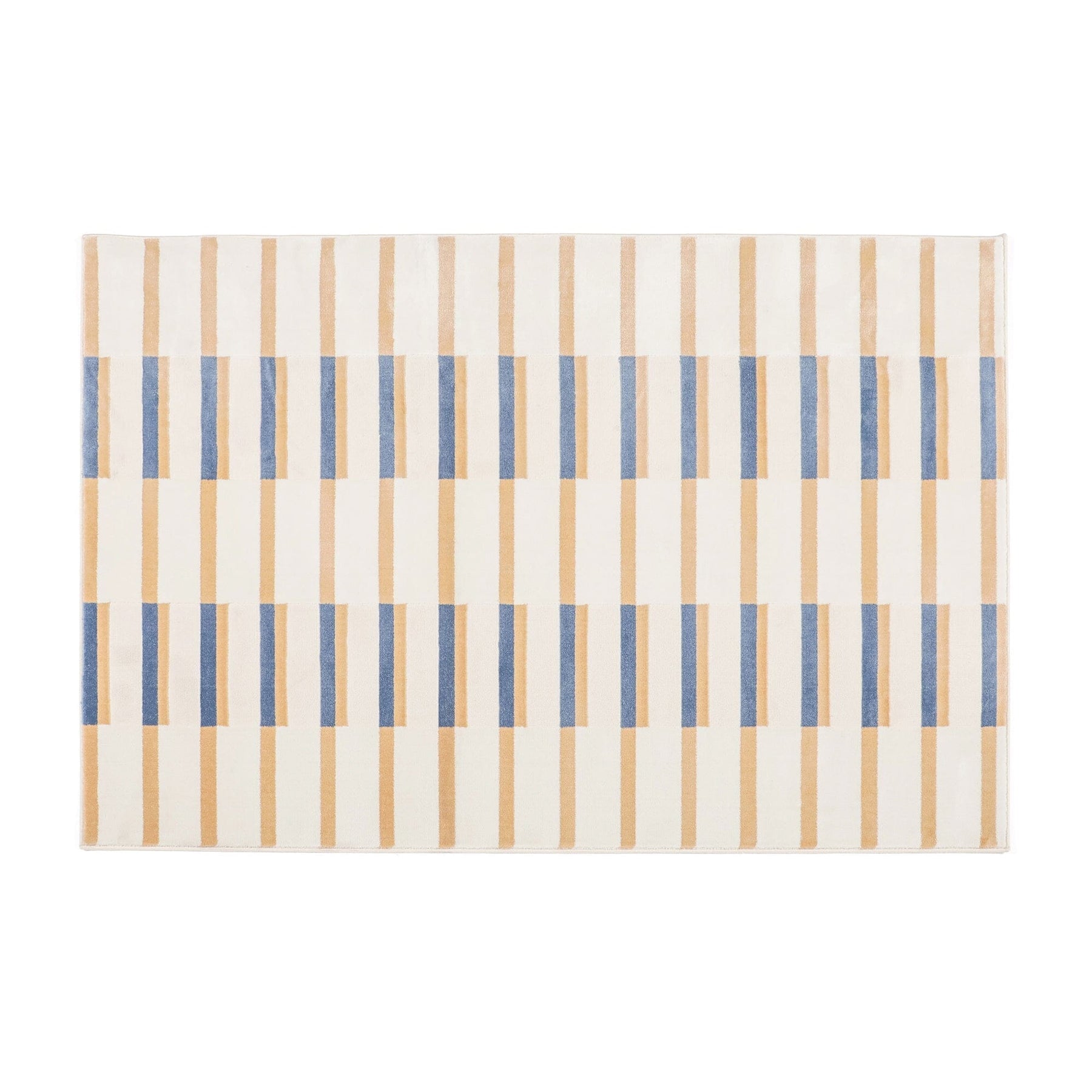 This rug features a geometric pattern in a sophisticated color scheme. The rhythmic stripes create a sense of light movement in the space. It uses the traditional Wilton weave technique. It's durable, breathable, and machine-woven, yet boasts the delicate, dense finish of a handwoven rug. Its short, smooth pile makes it easy to care for and ideal as a dining rug. It's comfortable all year round. It's also compatible with heated carpets and underfloor heating. The name "Mitte" (meaning "center"), German for "comfort," reflects the geometric pattern and warm color scheme that bring comfort to the center of everyday life. [About Welton Weave] This traditional weaving technique originated in the Wilton region of England and is now used for luxury rugs. The loom creates a dense, three-dimensional pile, allowing for the beautiful expression of intricate patterns and rich colors. It is highly durable and of such high quality that it is used in hotels and public spaces.