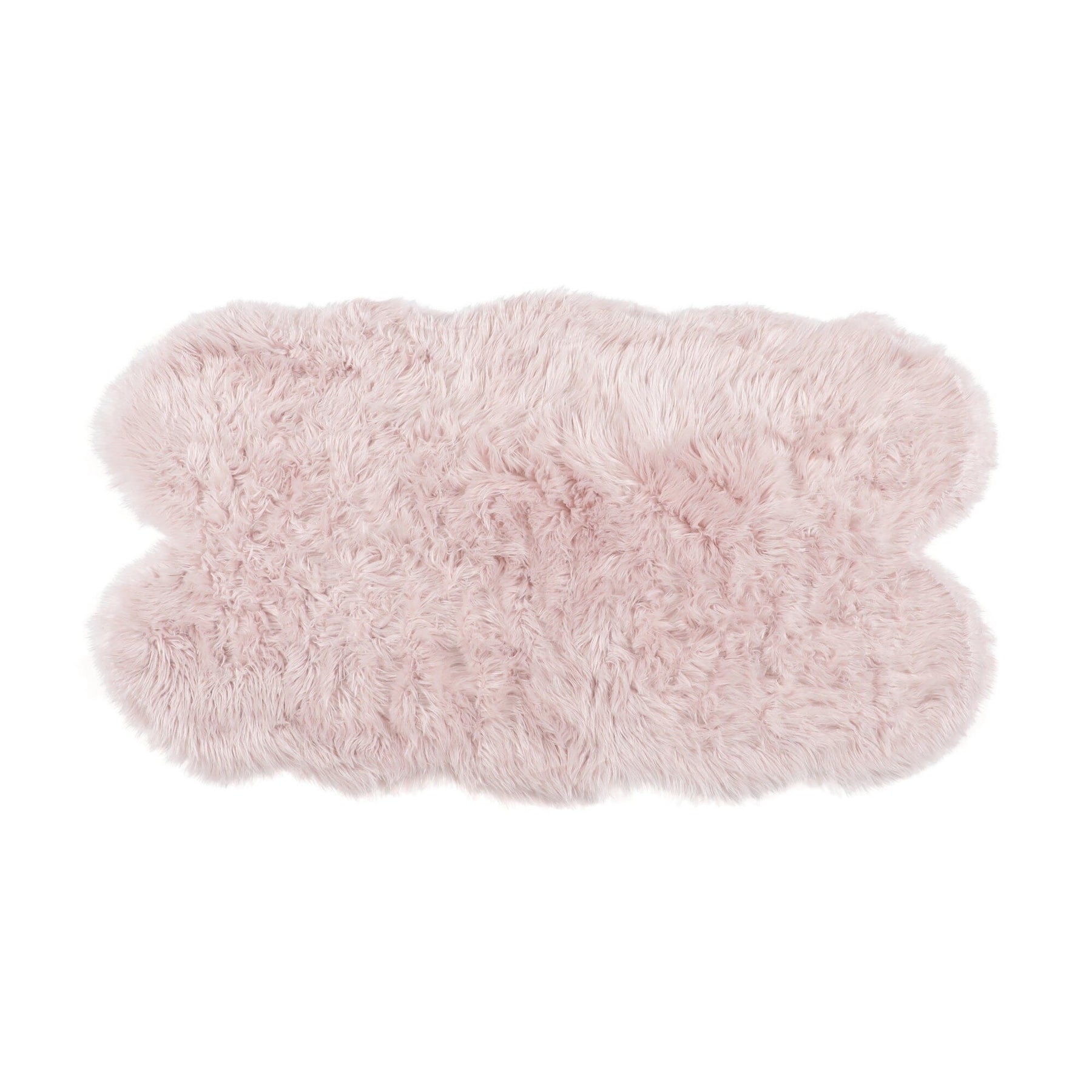 This rug features a wintery design featuring soft, shearling-like faux fur.