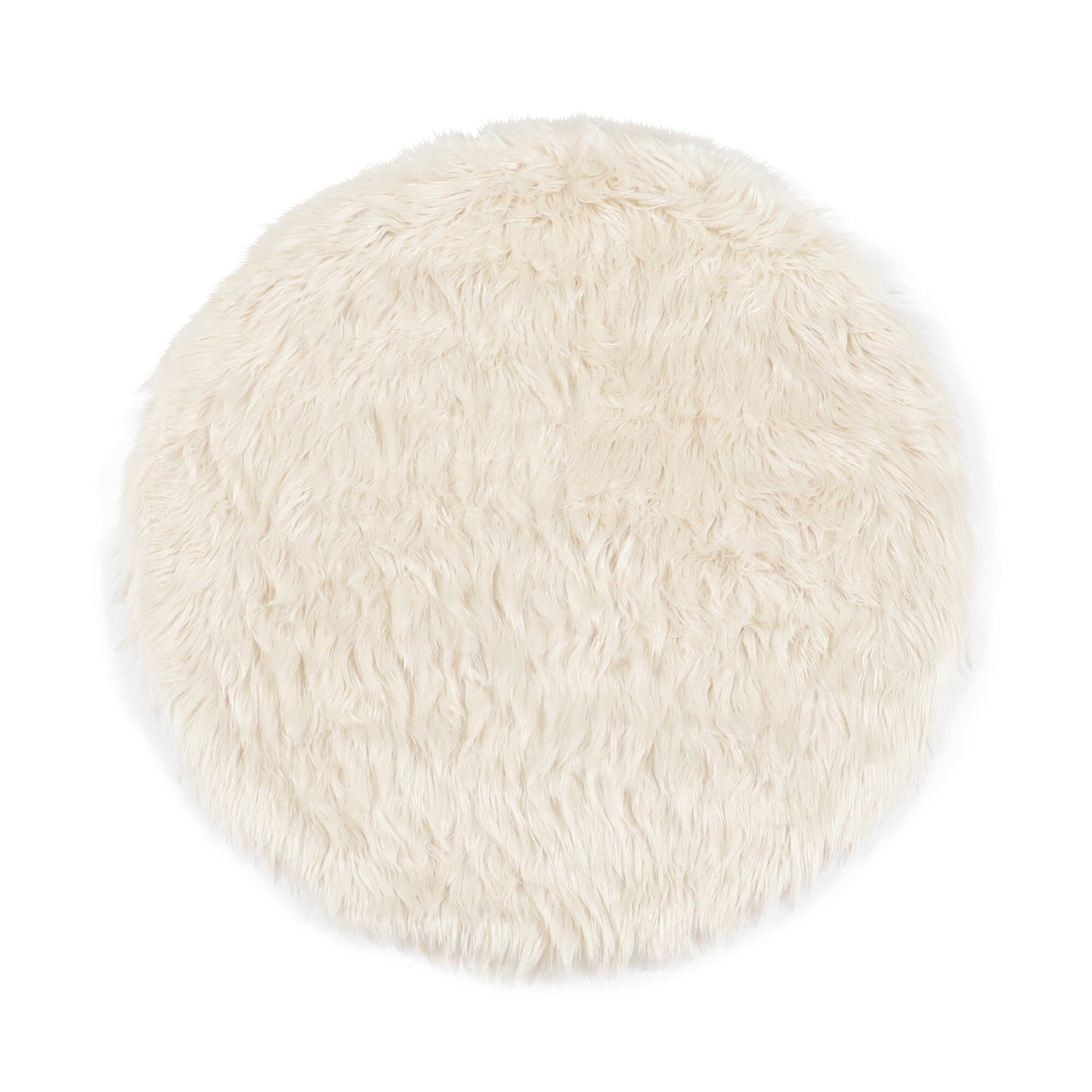 This round rug features a wintery design made with soft, sheepskin-style faux fur.