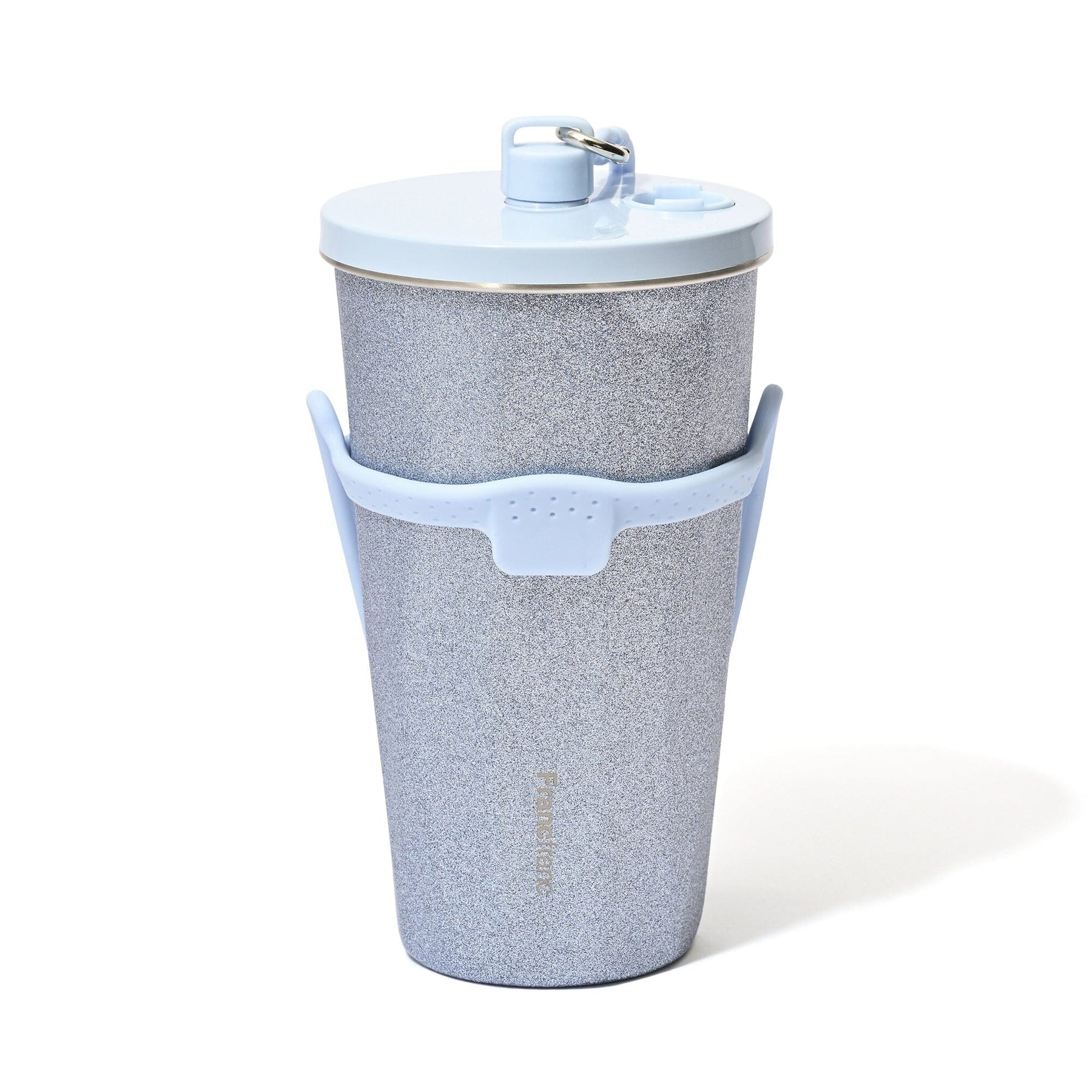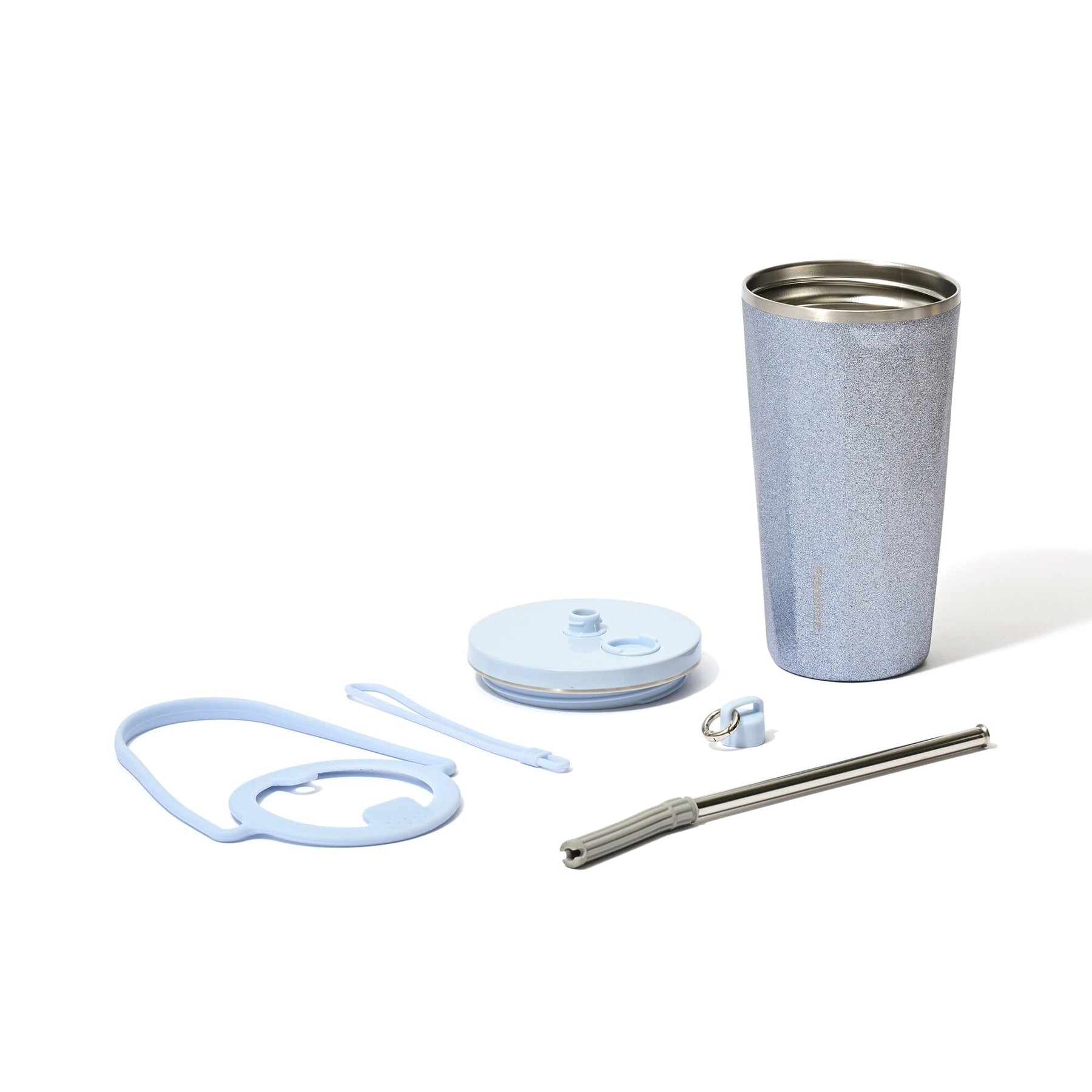 This stainless steel tumbler with a straw features eye-catching sparkling glitter.