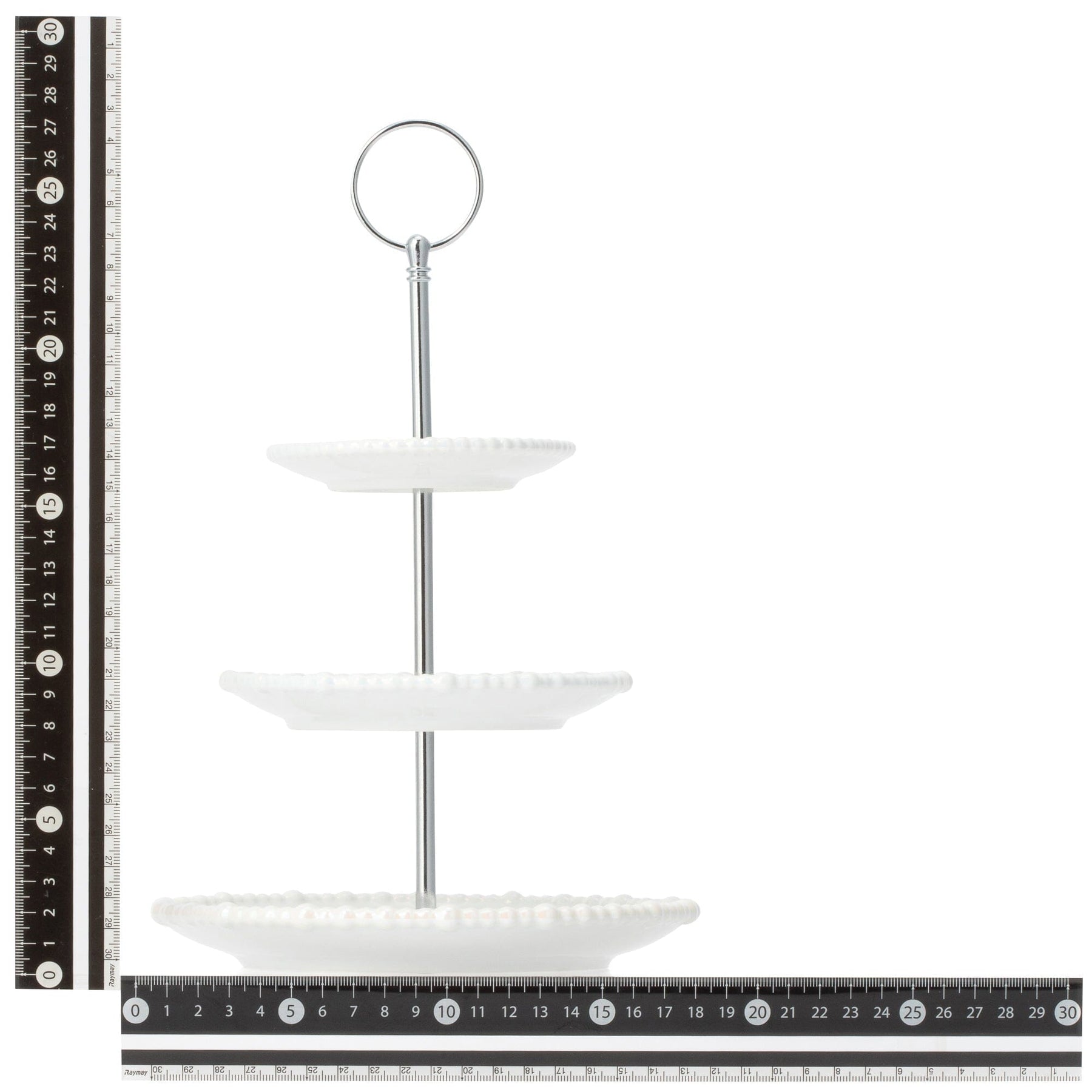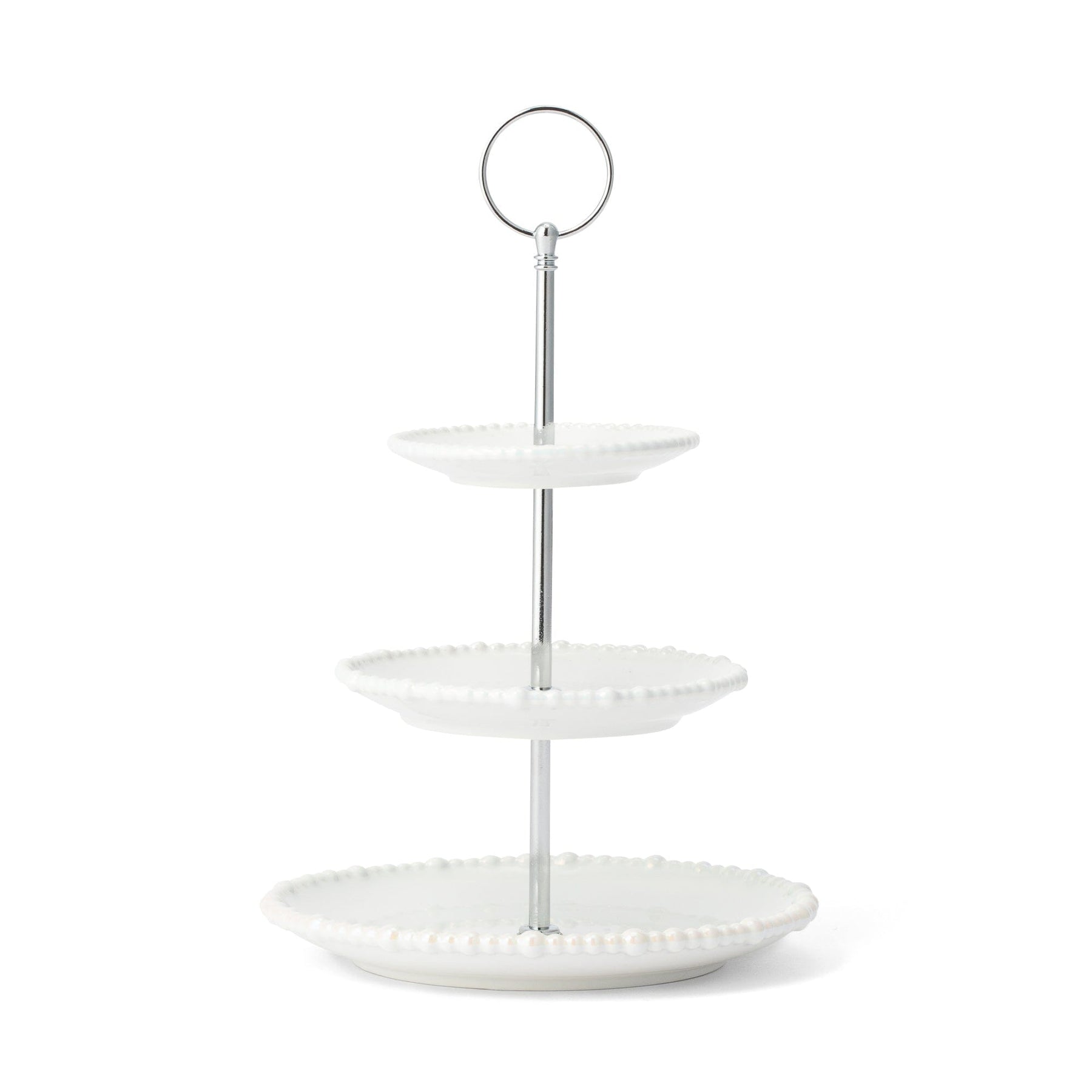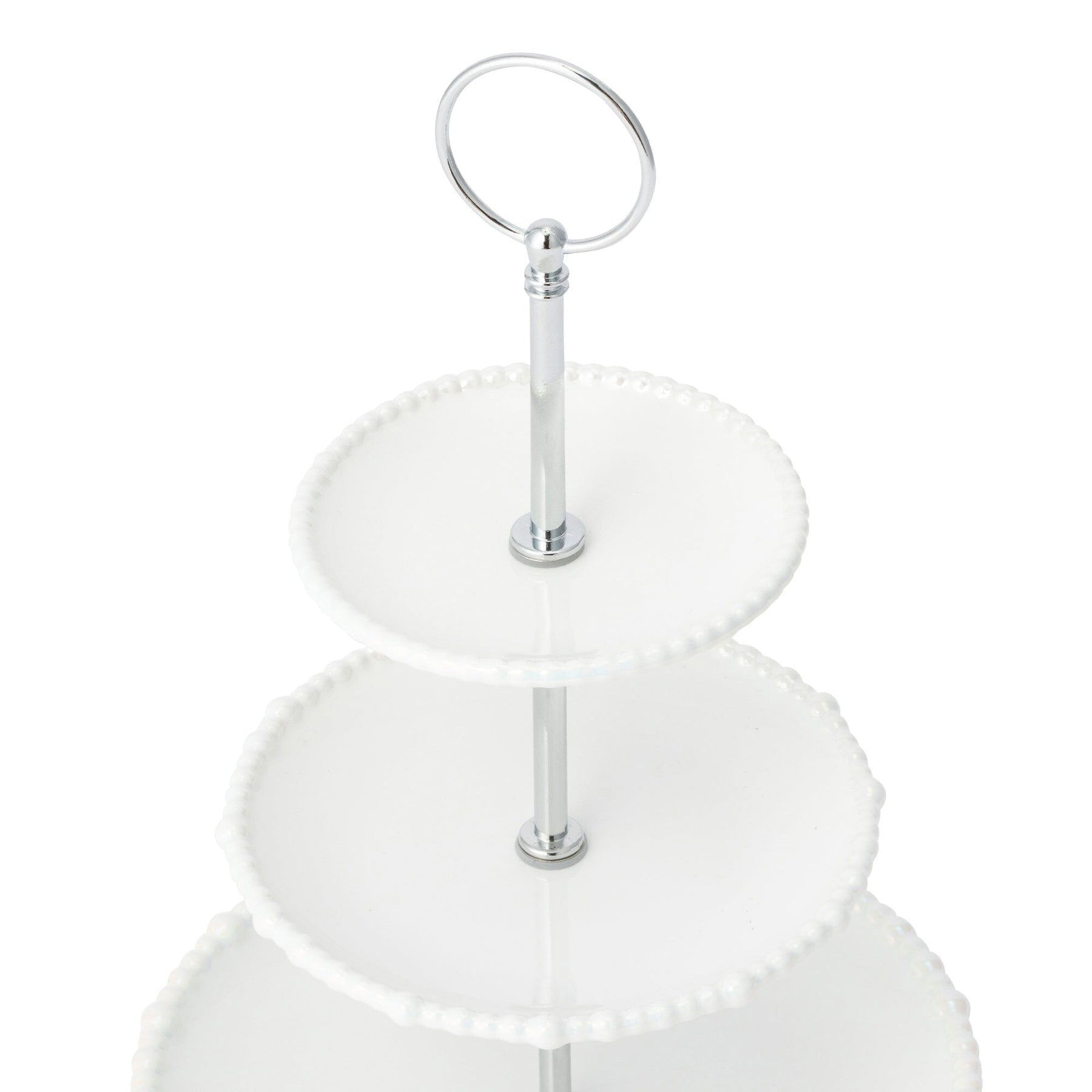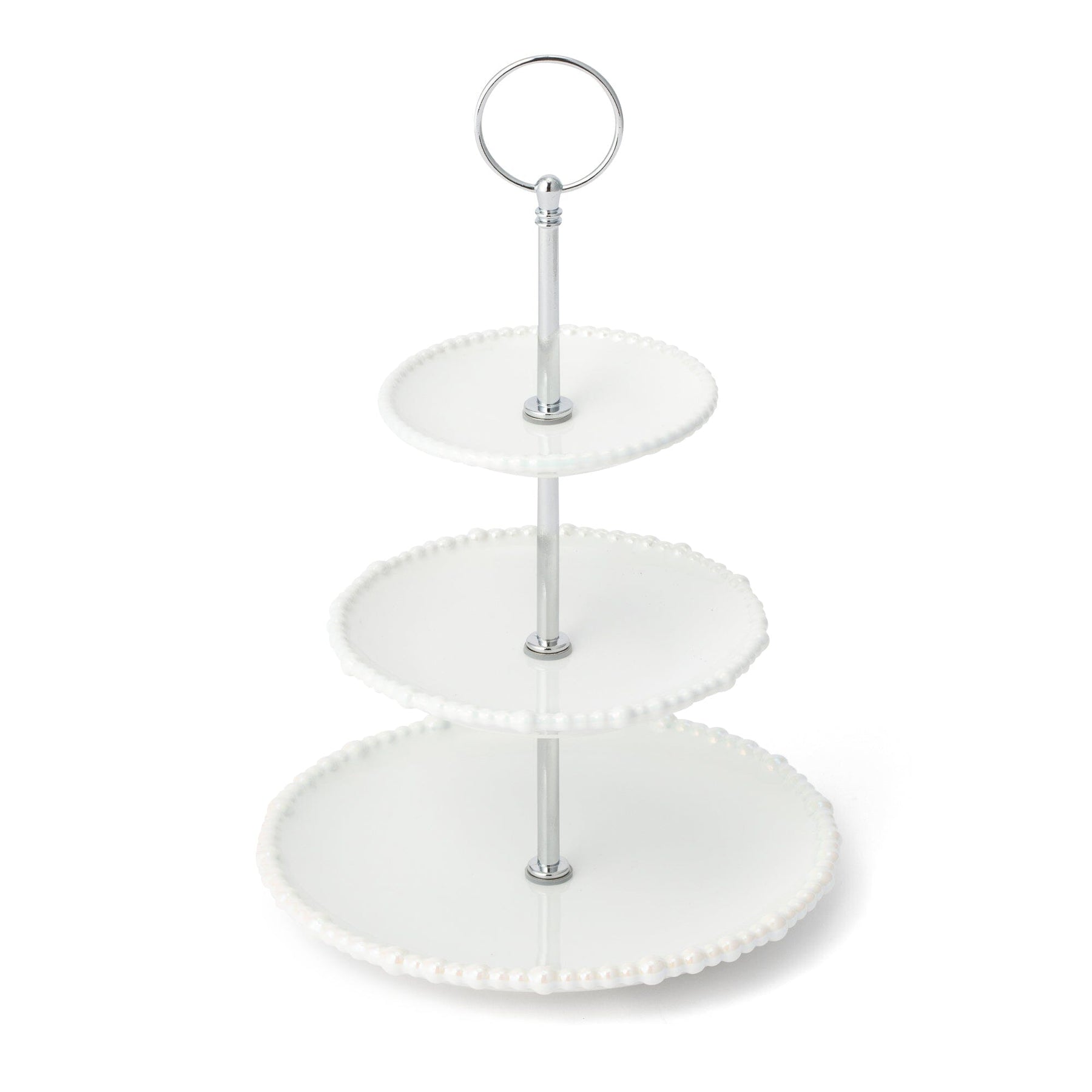 A three-tiered cake stand decorated with randomly sized pearls on the rim.