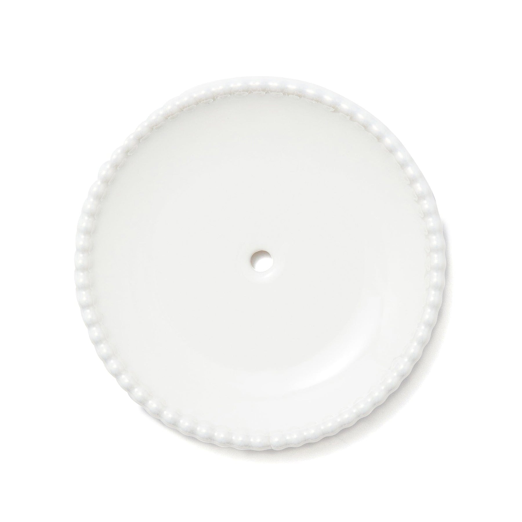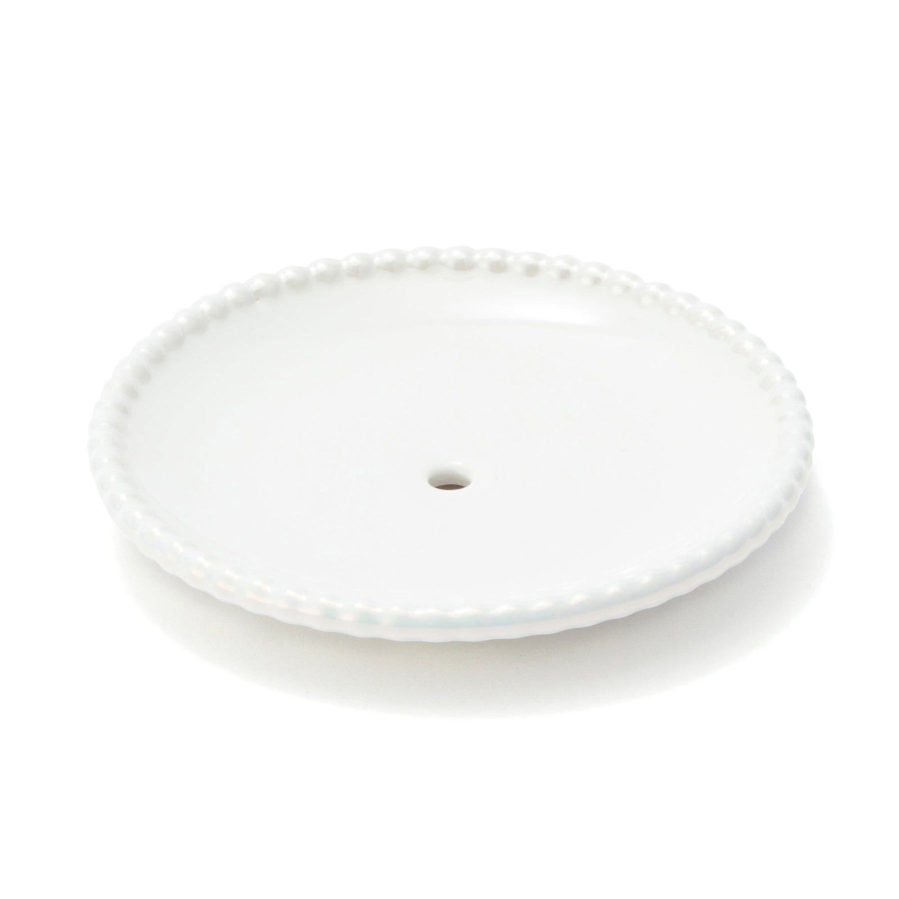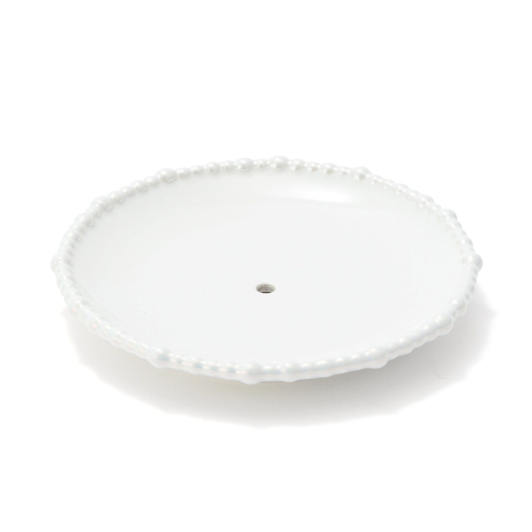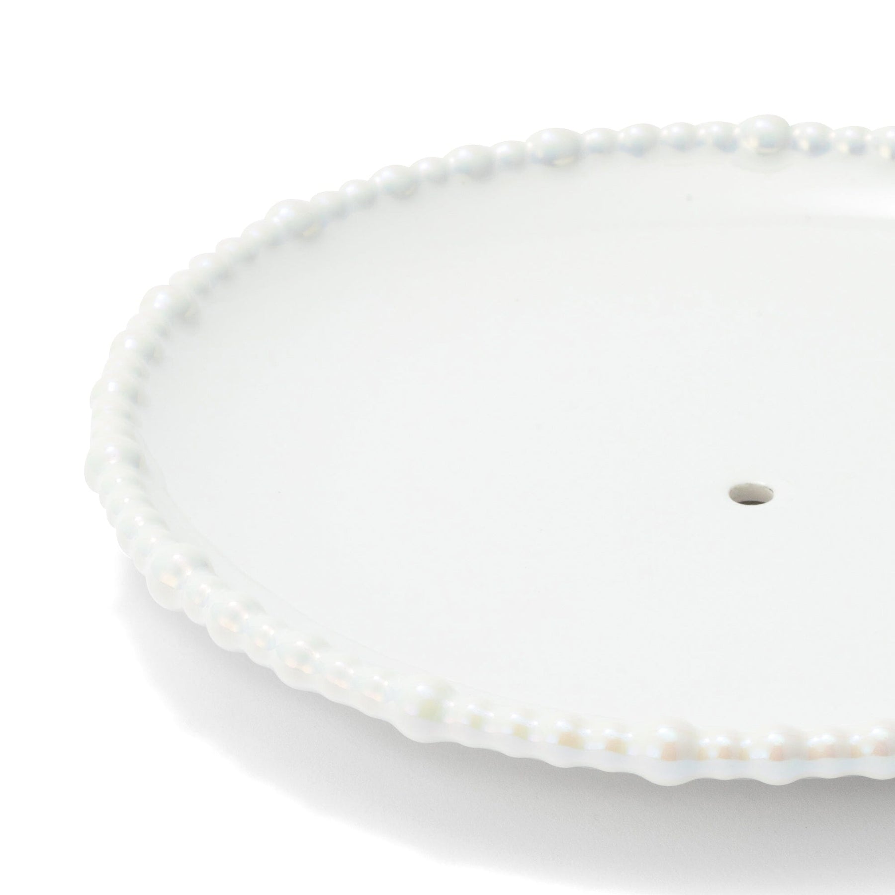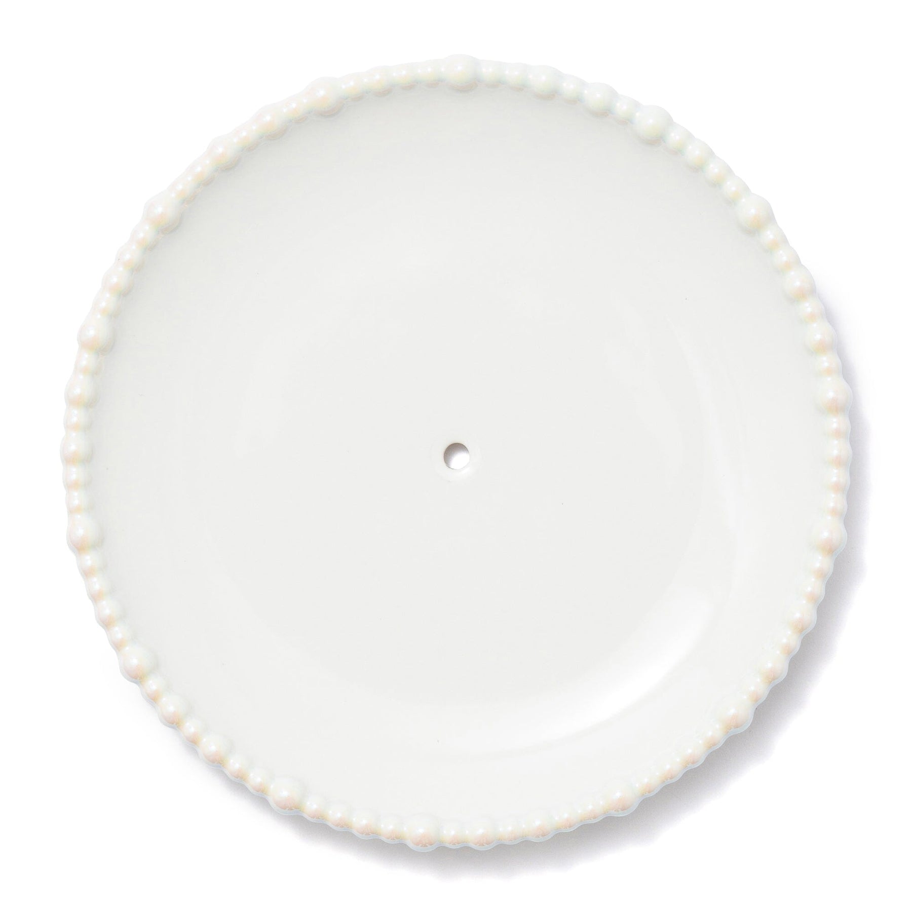 A three-tiered cake stand decorated with randomly sized pearls on the rim.