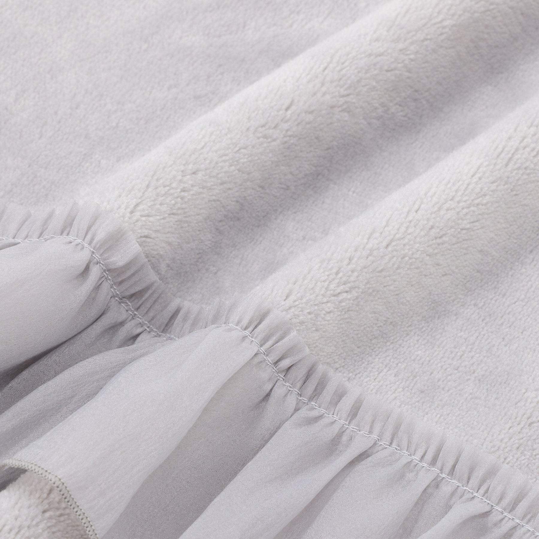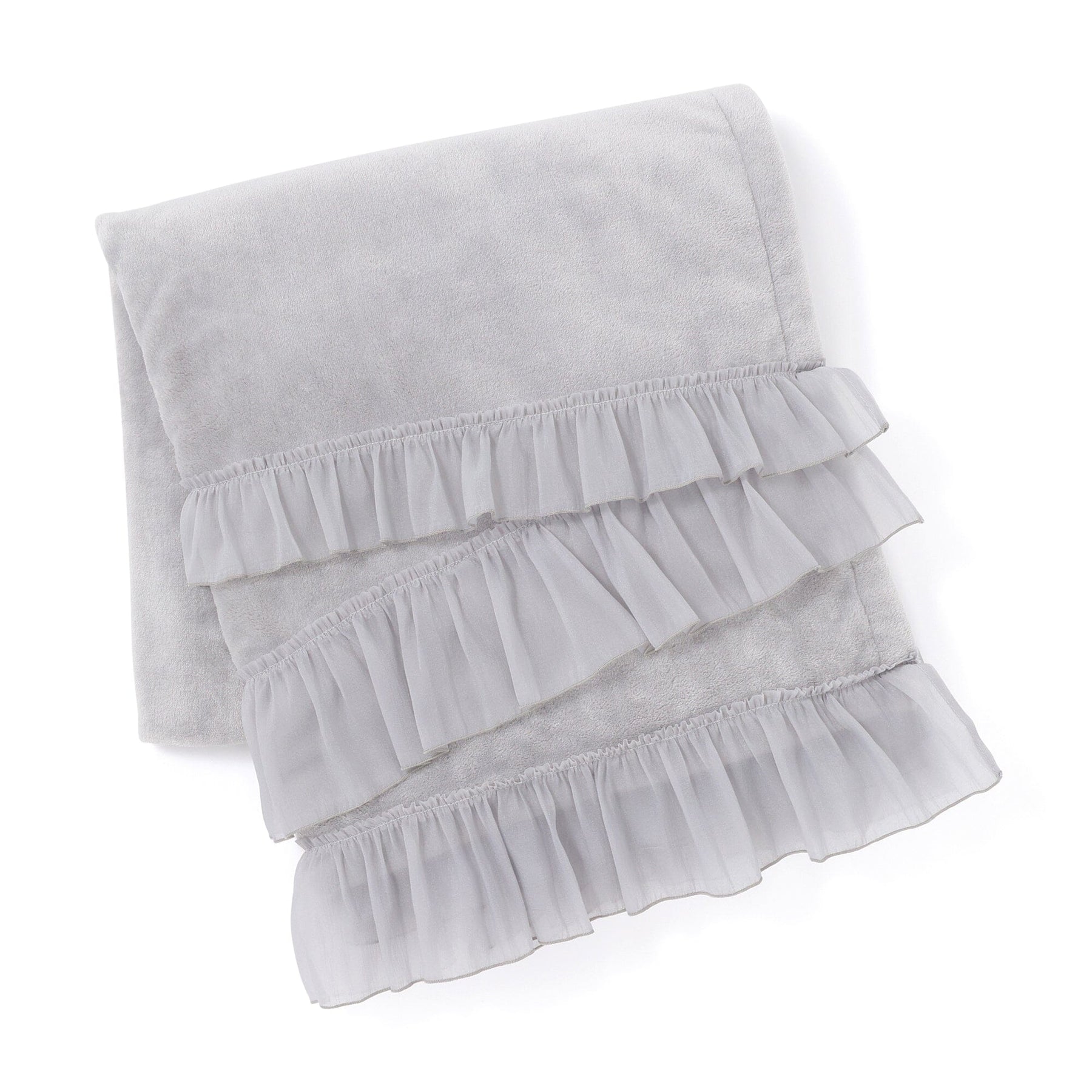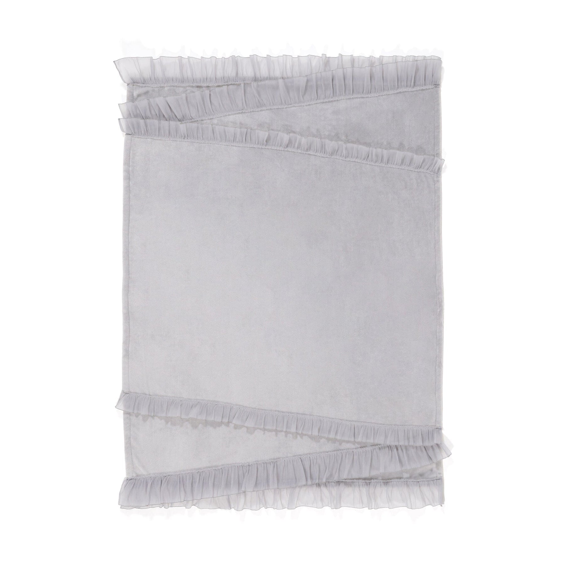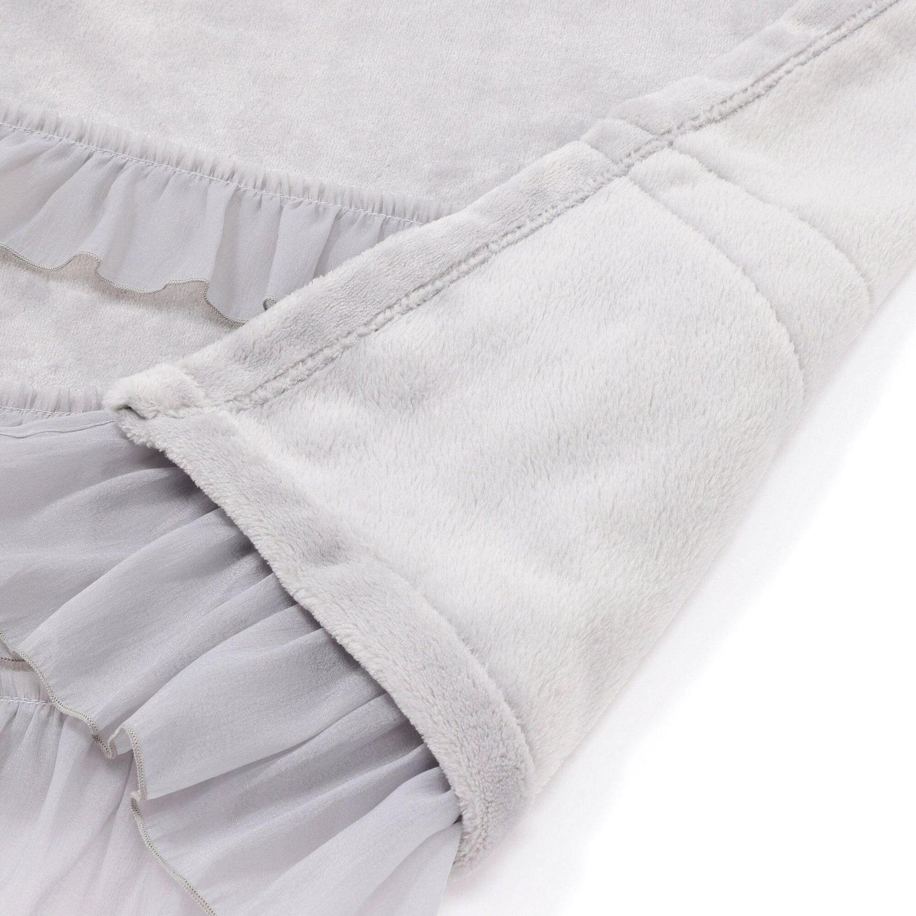 This throw (lap blanket) is made of smooth microfiber fabric with soft organza ruffles.The marshmallow-like texture is addictive once you touch it.