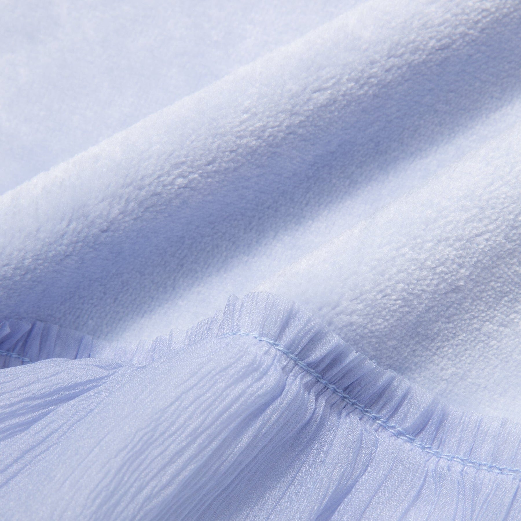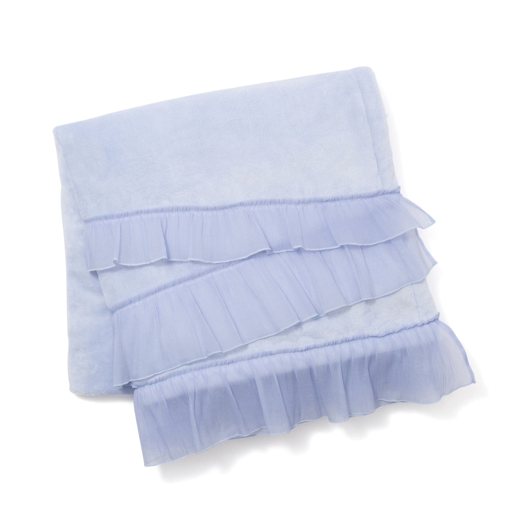 This throw (lap blanket) is made of smooth microfiber fabric with soft organza ruffles.The marshmallow-like texture is addictive once you touch it.