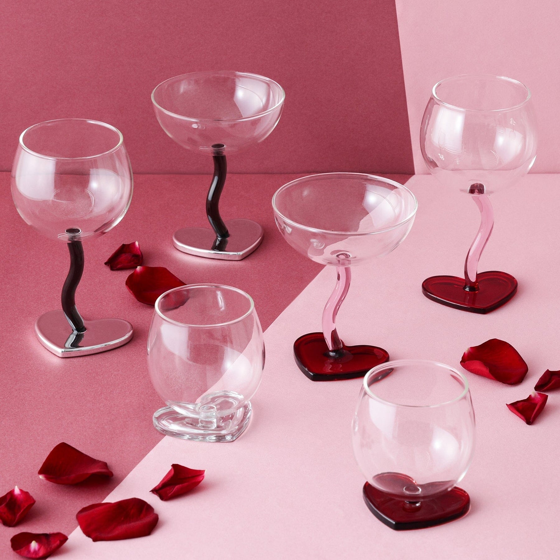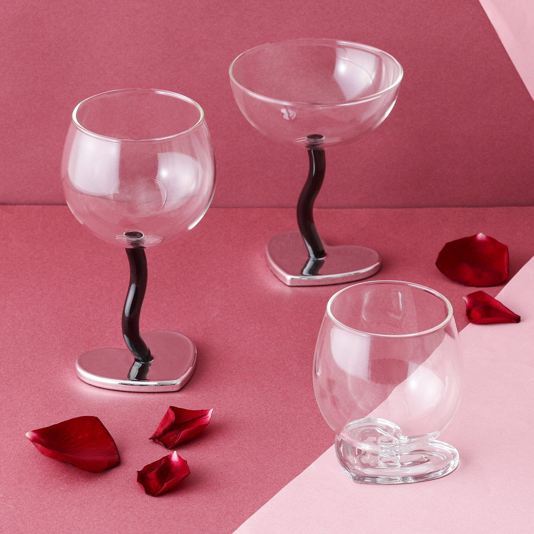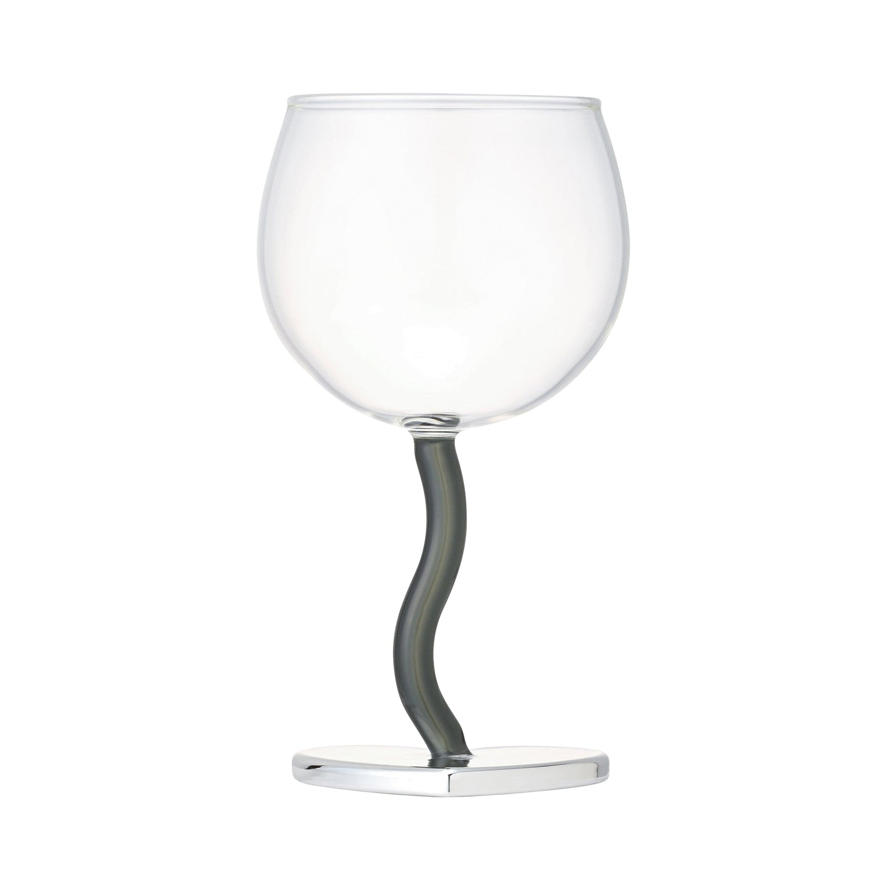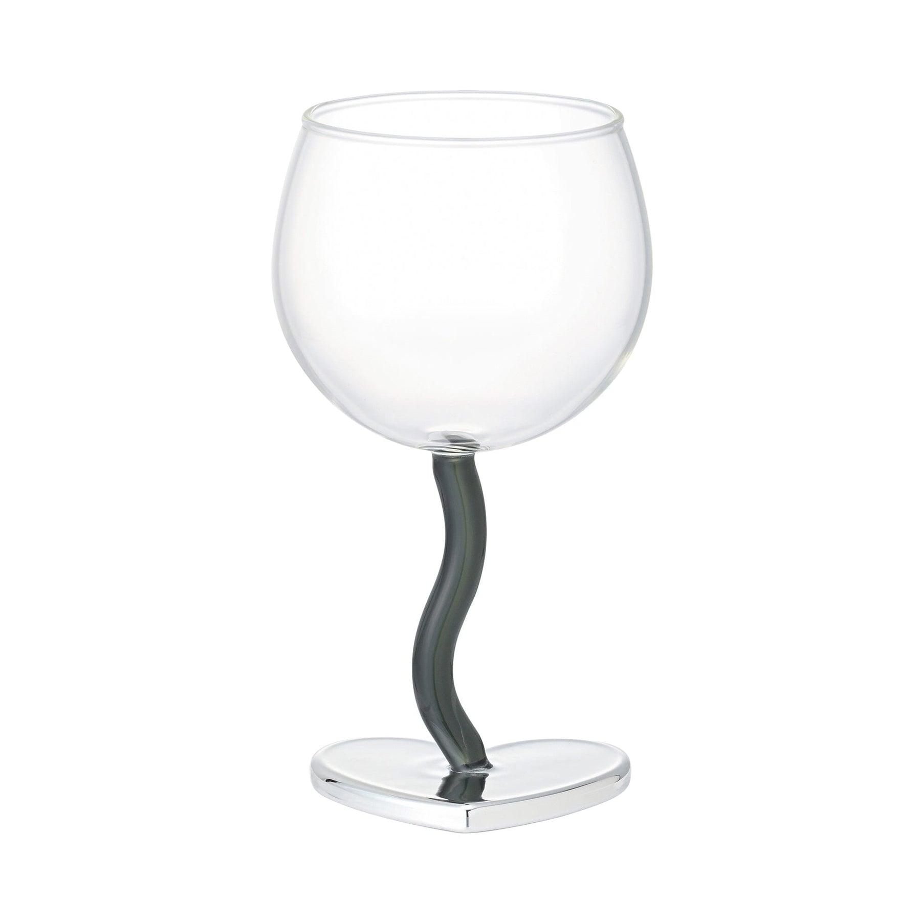This wine glass features a trendy heart motif.The trendy silver heart and wavy stem design are cute.